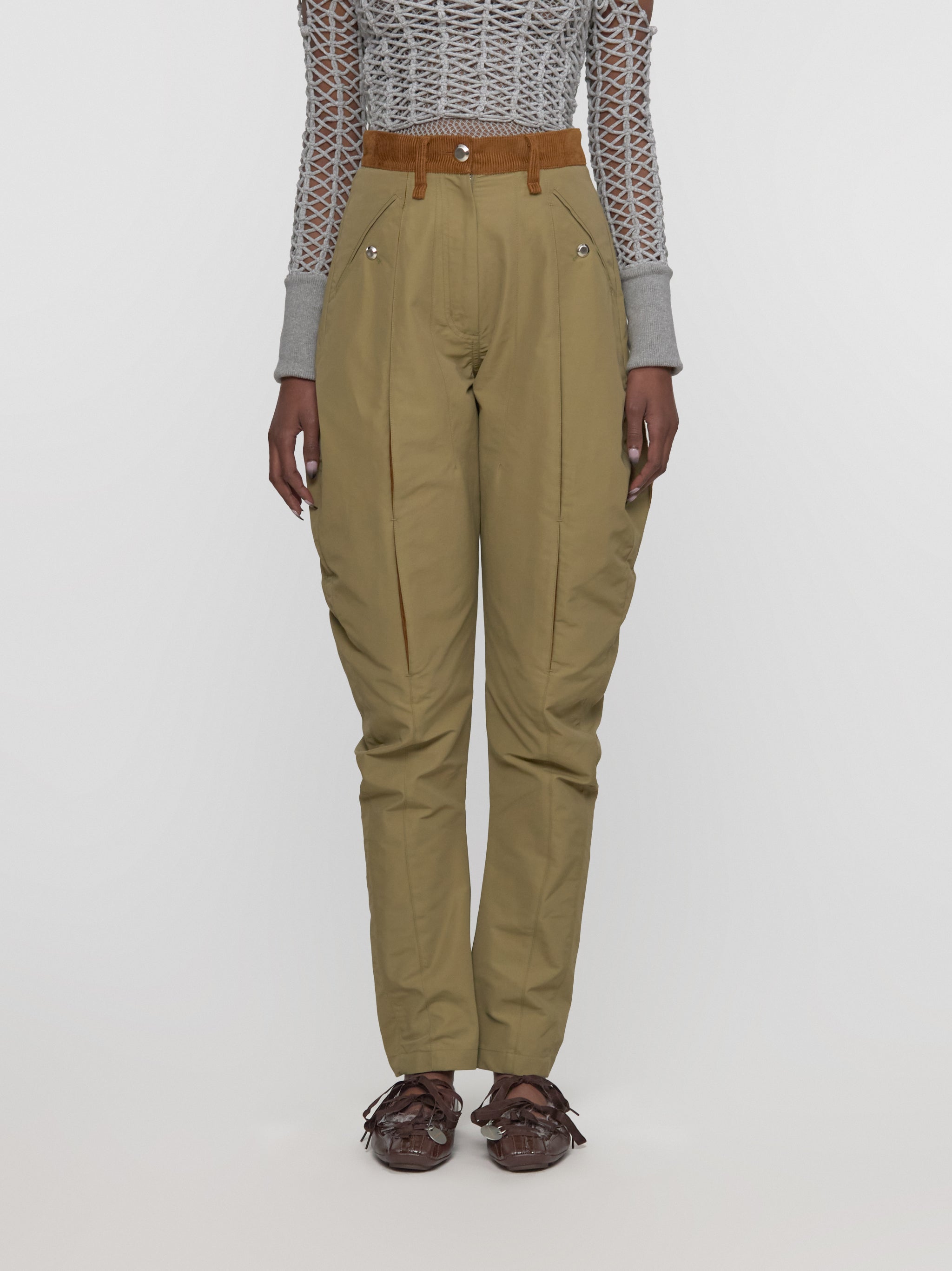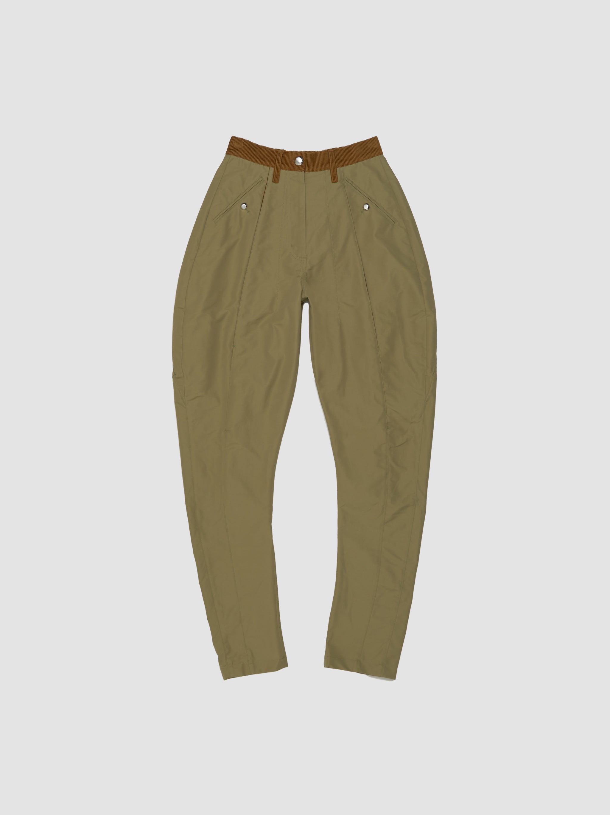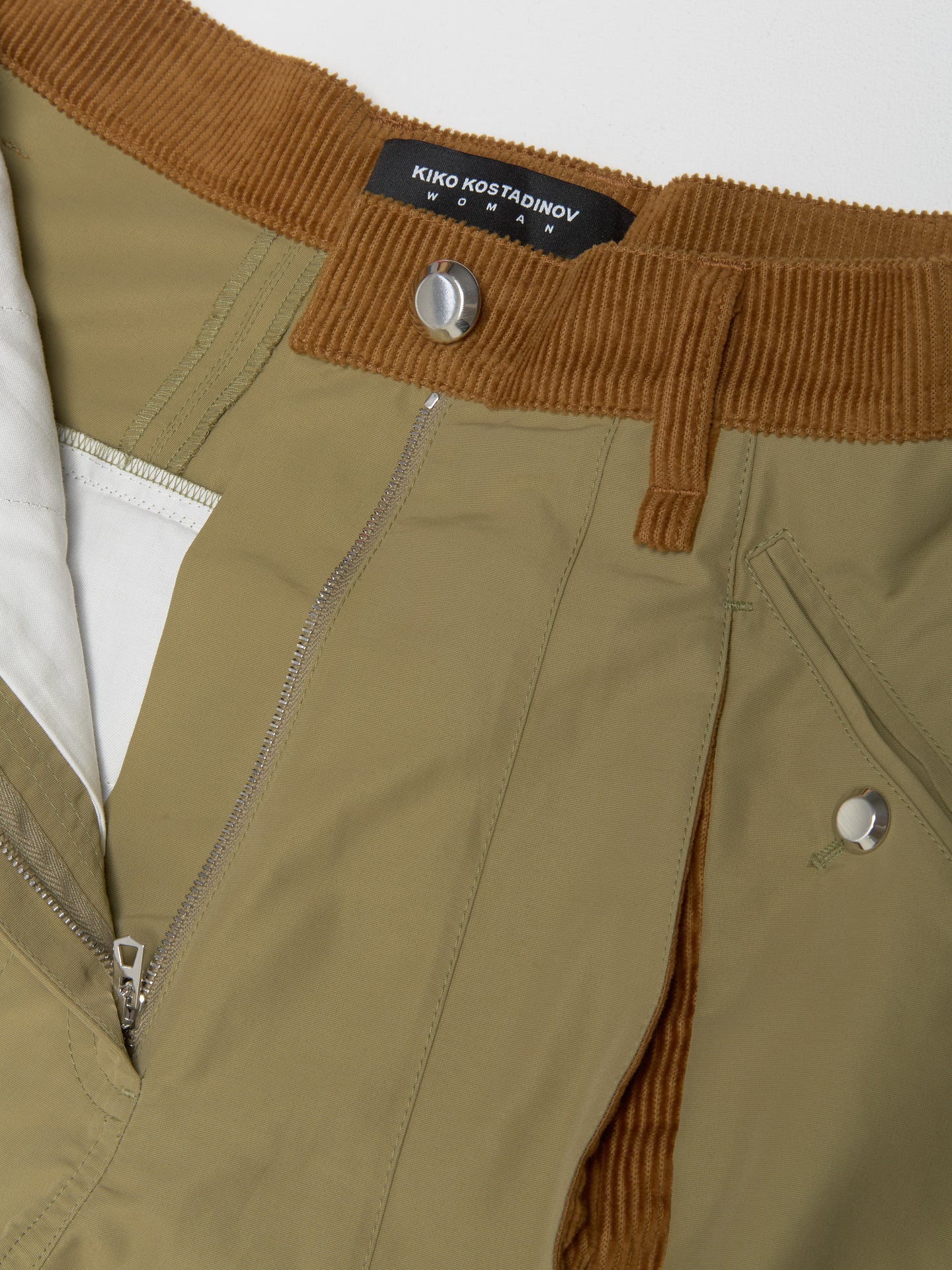 KIKO KOSTADINOV Chasseur Trouser in Olive Green & Honey are made from a cotton blend following a fitted silhouette with inverted pleats throughout.