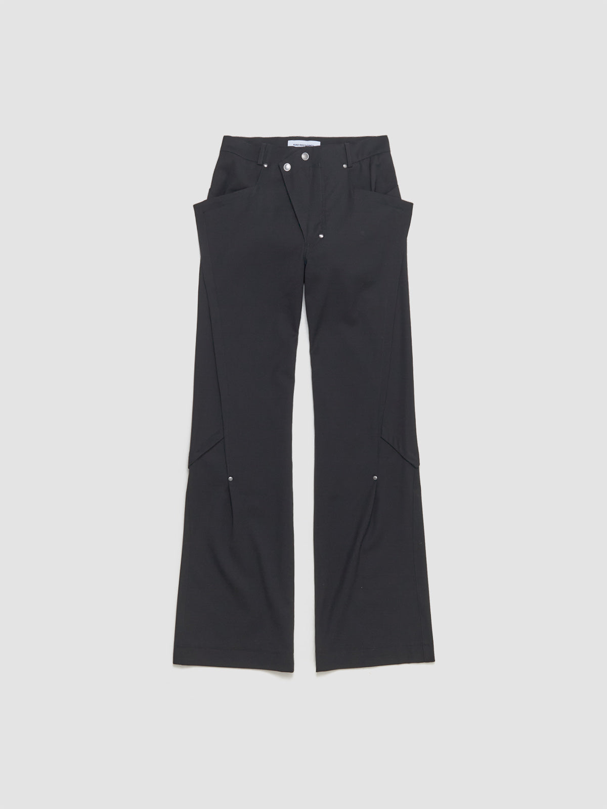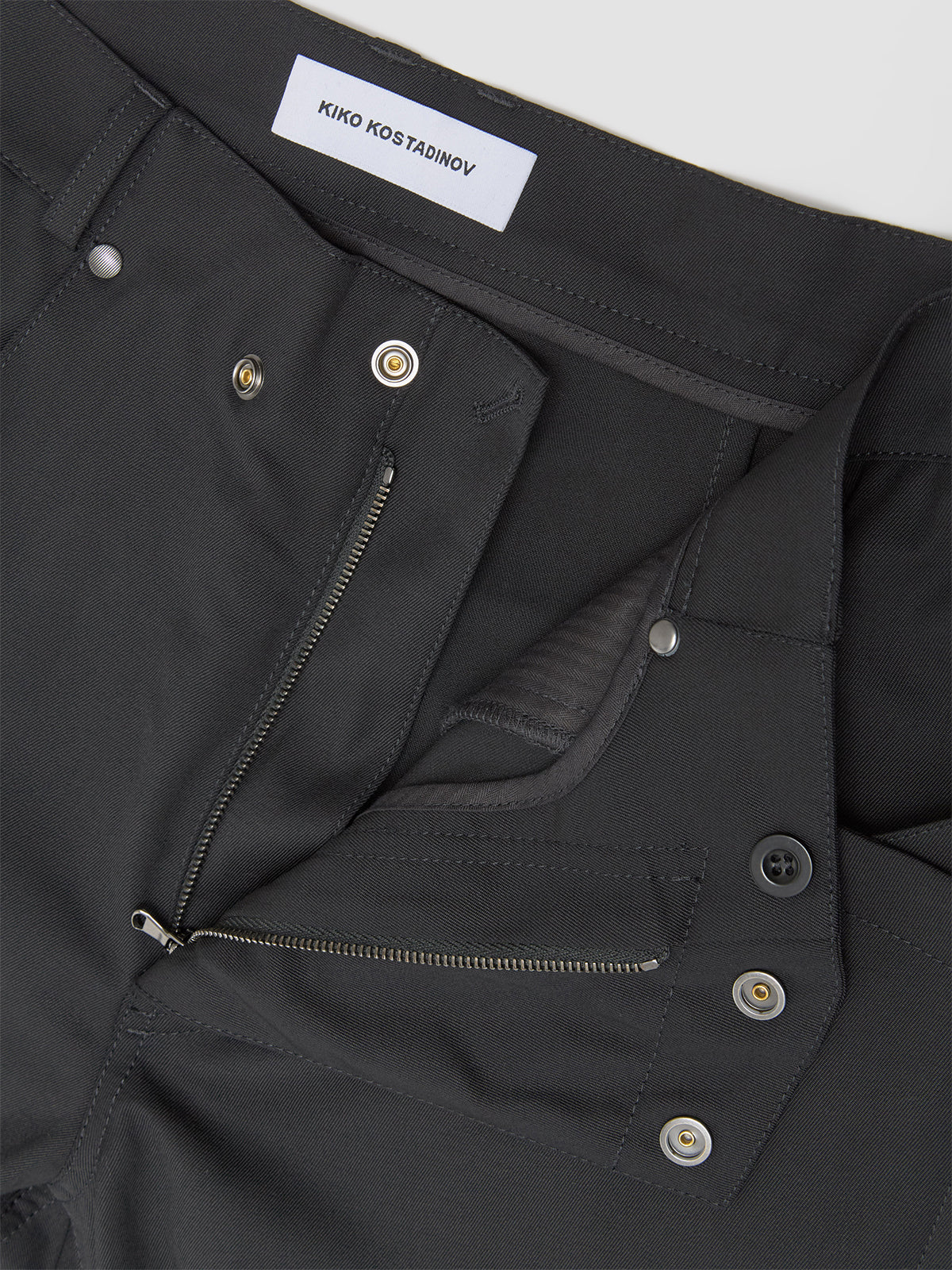 KIKO KOSTADINOV Kraner Trousers in Crow Black is made from a wool blend following a straight silhouette with asymmetric fly opening.