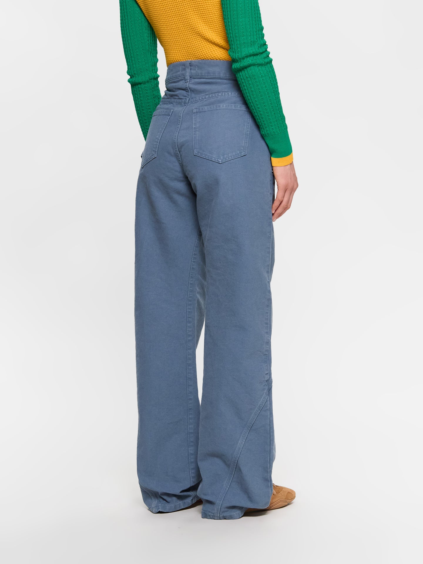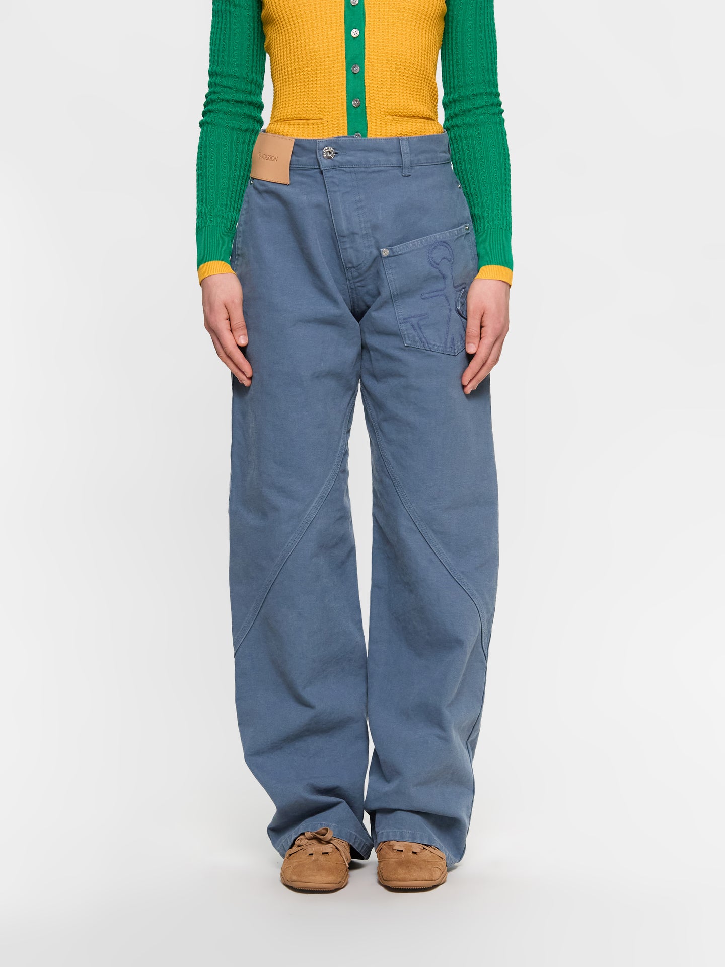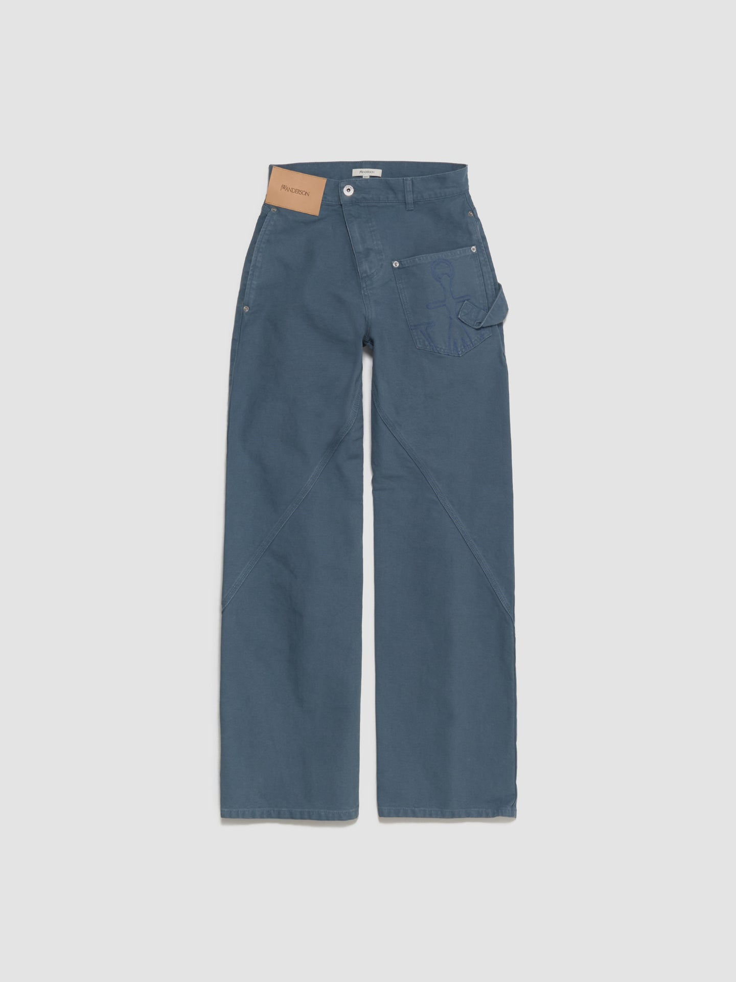 JW Anderson Twisted Workwear Trousers in Steel Blue are made from 100% cotton following a wide leg silhouette with a leather patch at the back.