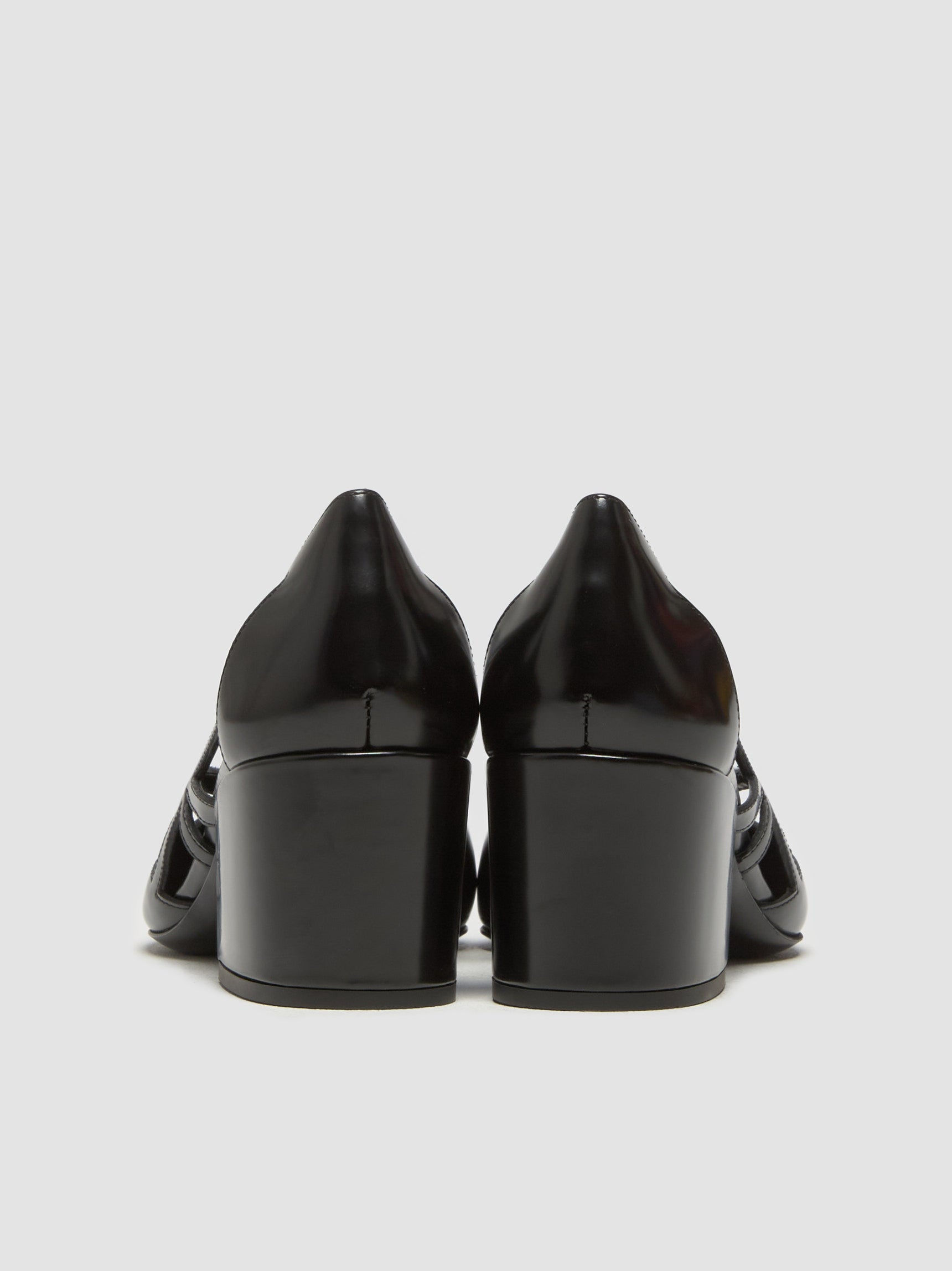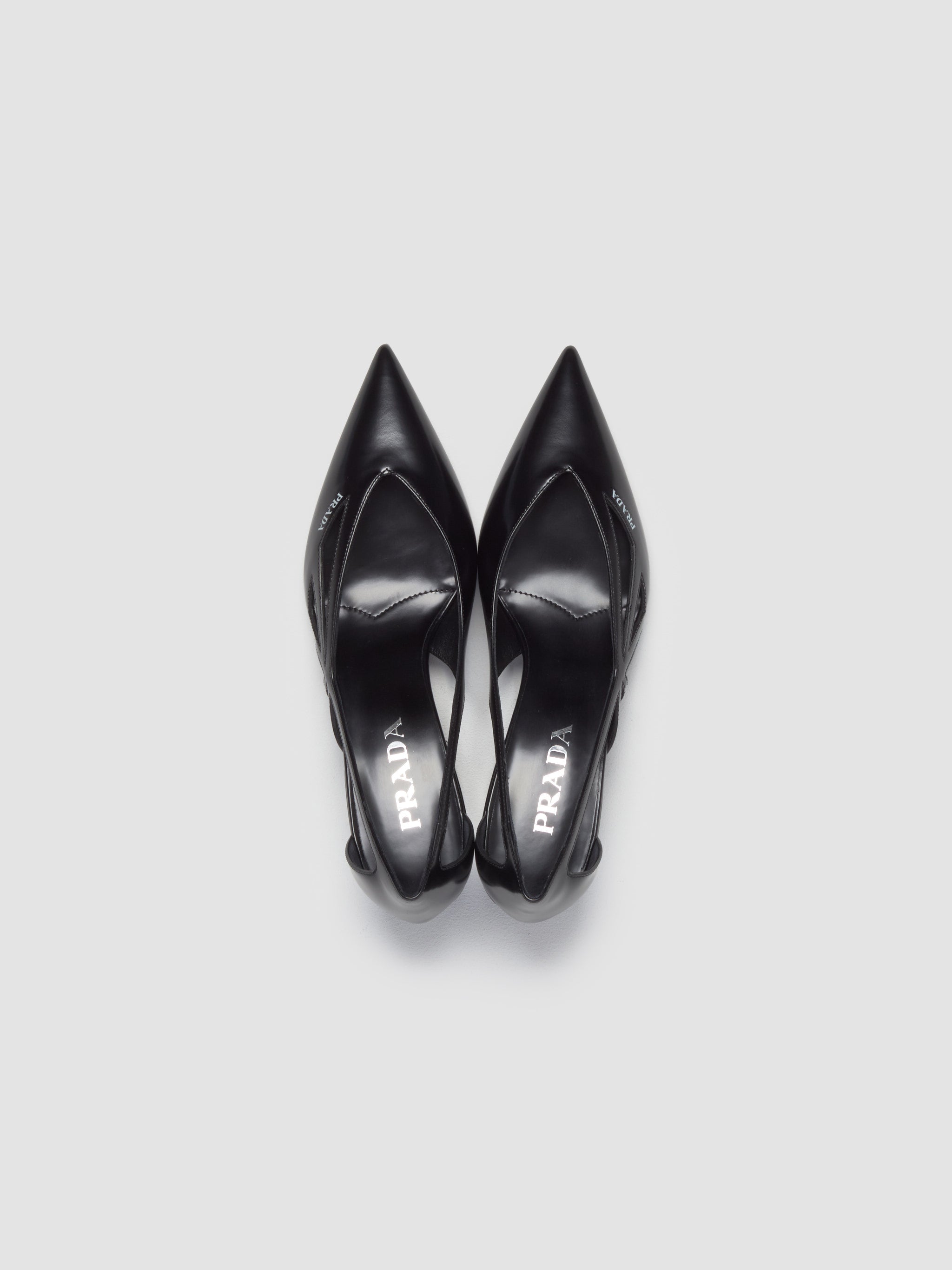 Prada Brushed Leather Cut-Out Pumps in Black are made from 100% leather featuring a pointed toe and a block heel.