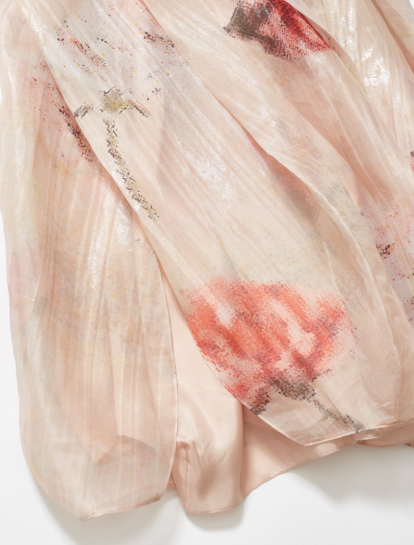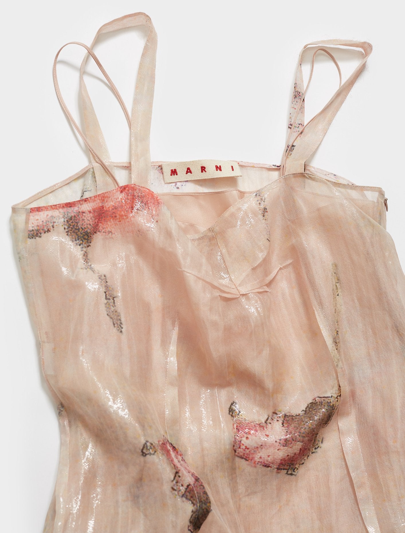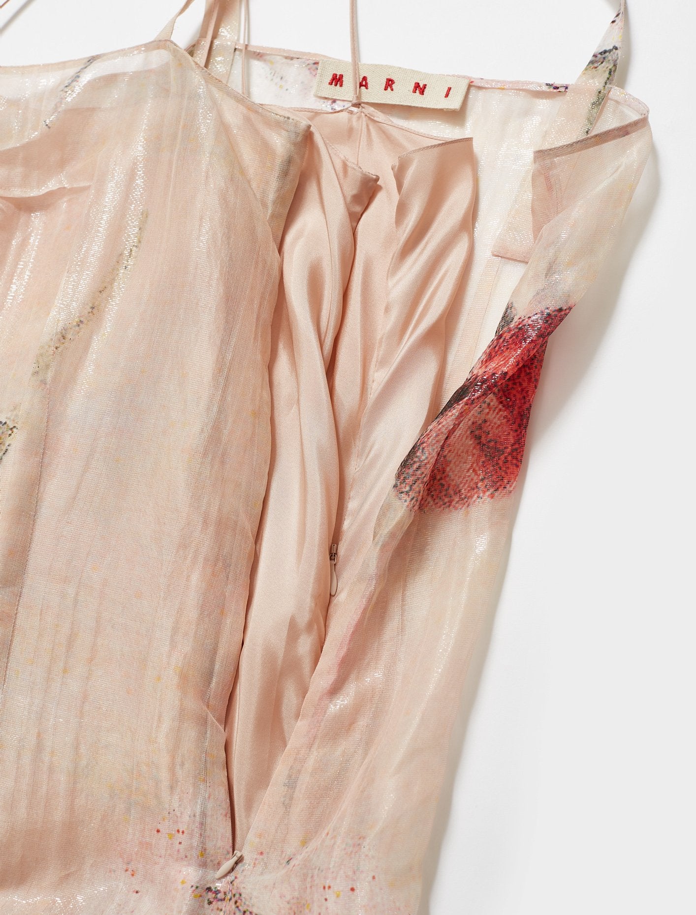 The Kat Dress from Marni's Spring Summer 2018 collection is a layered, semi–sheer silk dress with a floral pattern. The slip dress follows a slim silhouette with spaghetti straps, the outer layer has an oversized fit with a draped balloon bottom and delicate draping at the bust. The dress is closed at the side with concealed zip fastening.