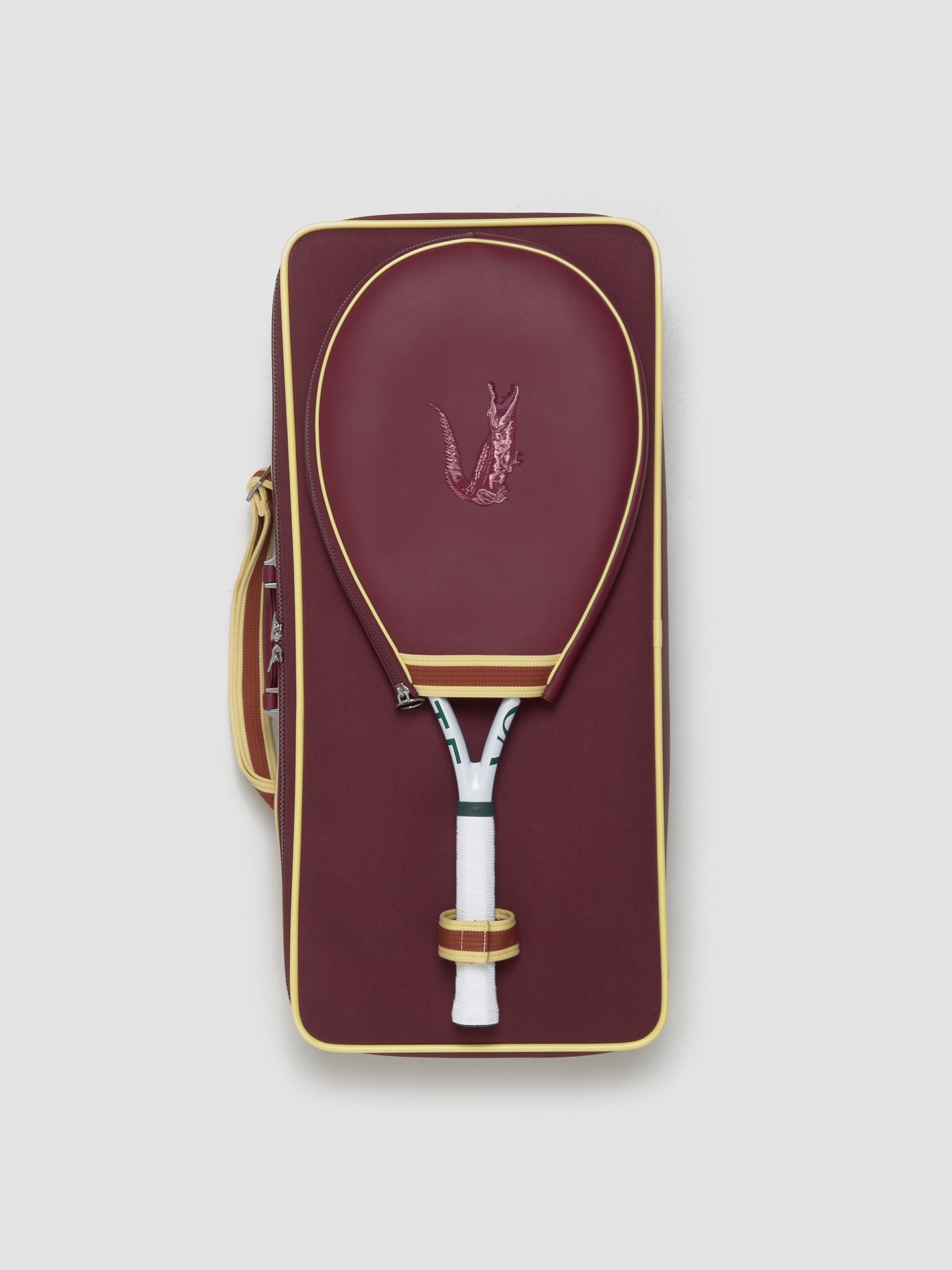 Lacoste x Voo Store Tennis Duffle Bag in Burgundy Jaune is made from cow leather featuring an external tennis racket compartment.