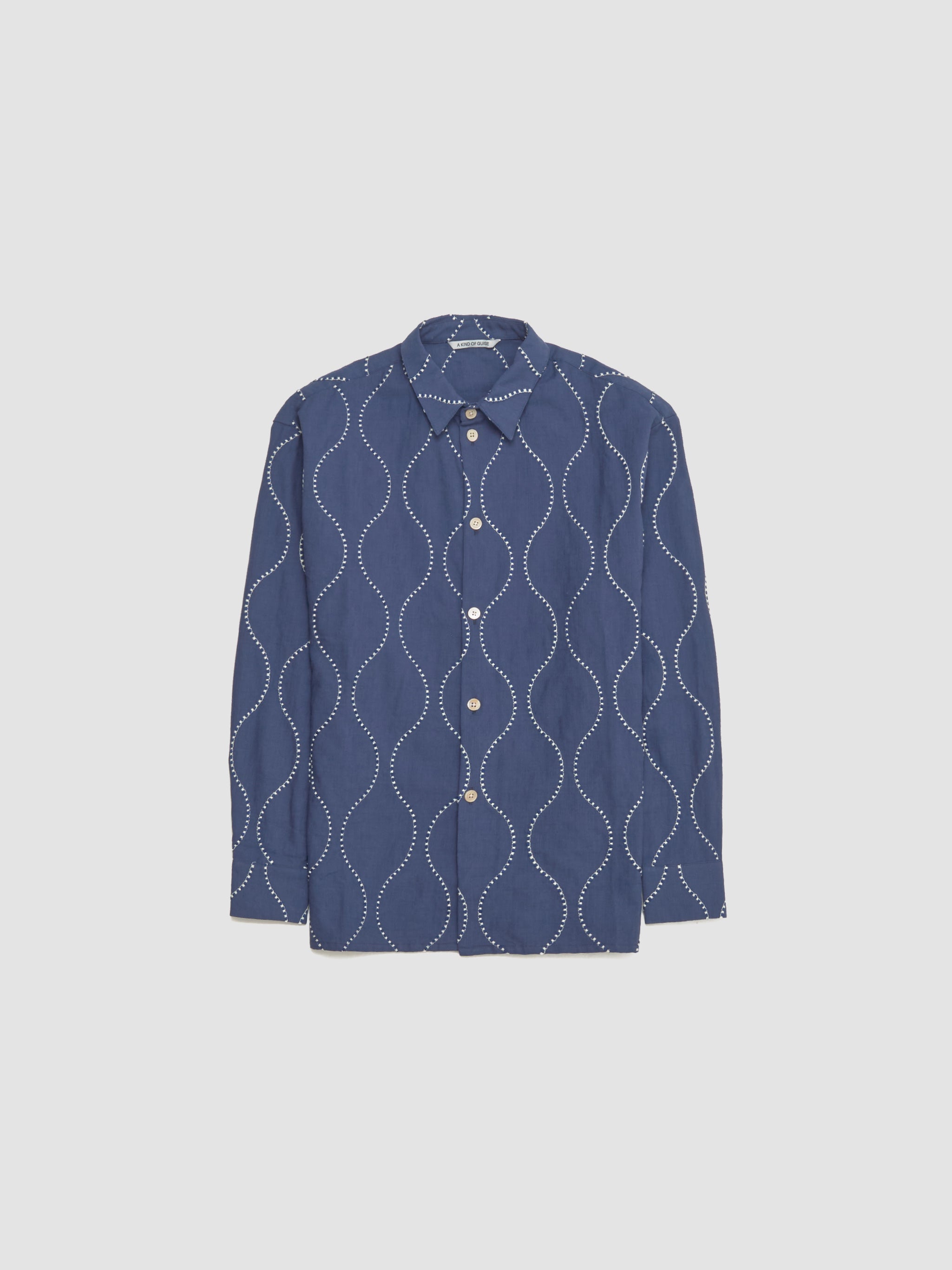 A Kind of Guise Pino Shirt in Ocean Waves is made from 100% cotton following a relaxed silhouette with an all-over embroidery stitching.