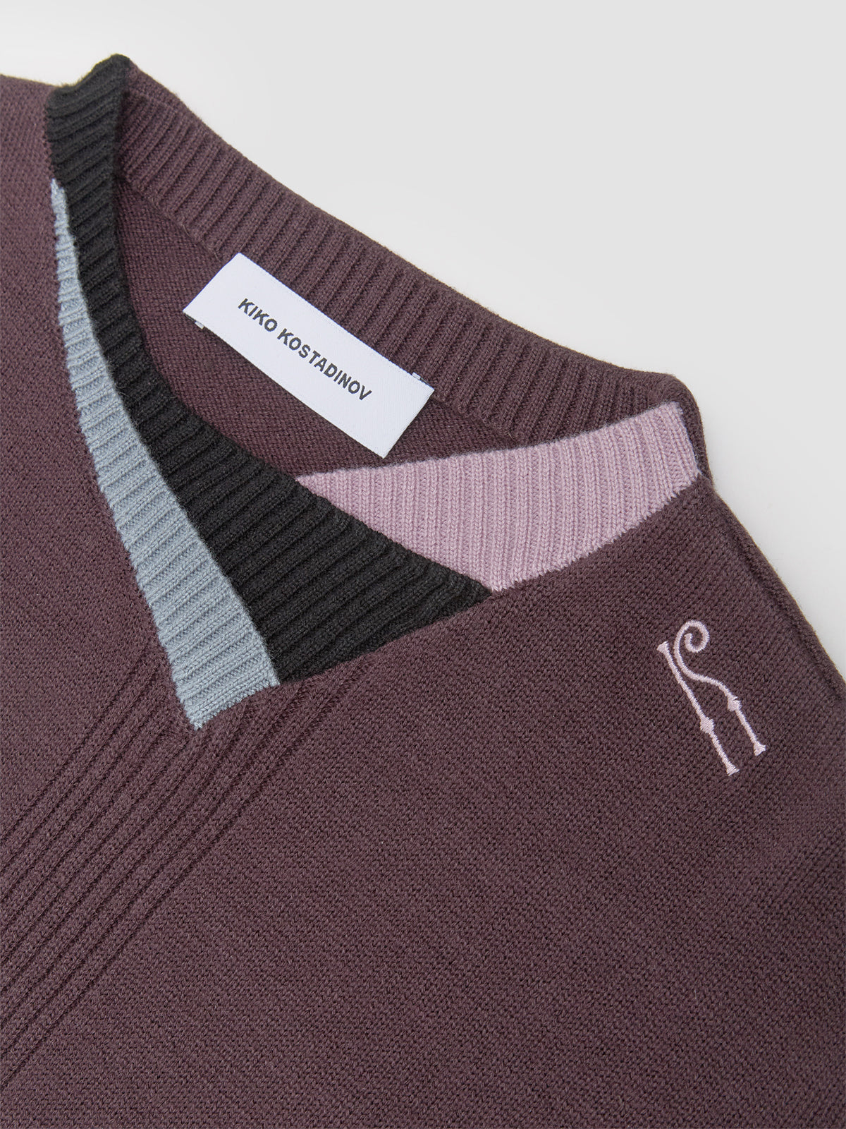 KIKO KOSTADINOV Vig Multi Collar Jumper in Dark Brown & Lilac is made from a wool blend following a relaxed silhouette with multicolor layered details on the collar.