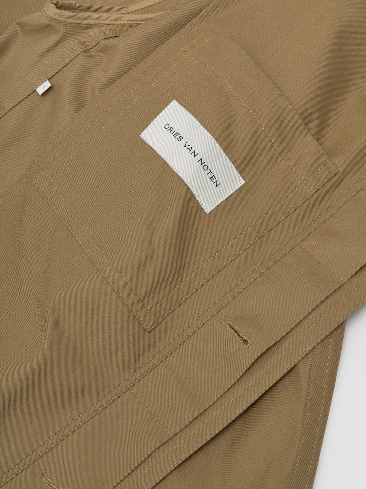 Dries Van Noten Robin Coat in Camel is made from 100% cotton following a loose silhouette with front flap pockets.