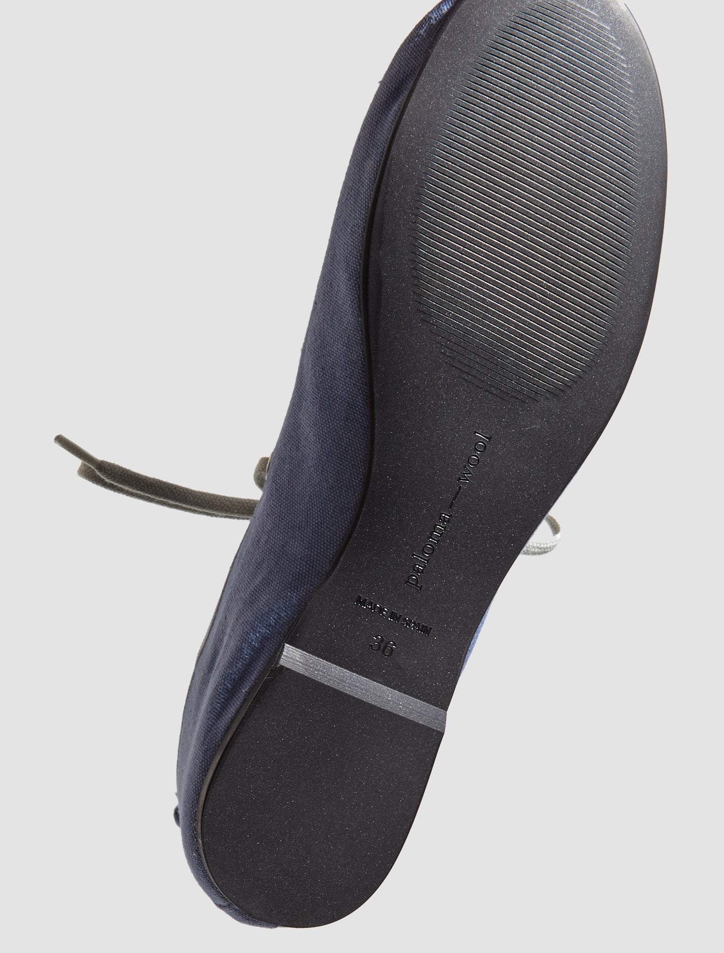 Paloma Wool Pina Lace–Up Ballerina in Blue is made from 100% cotton featuring a lace–up closure.