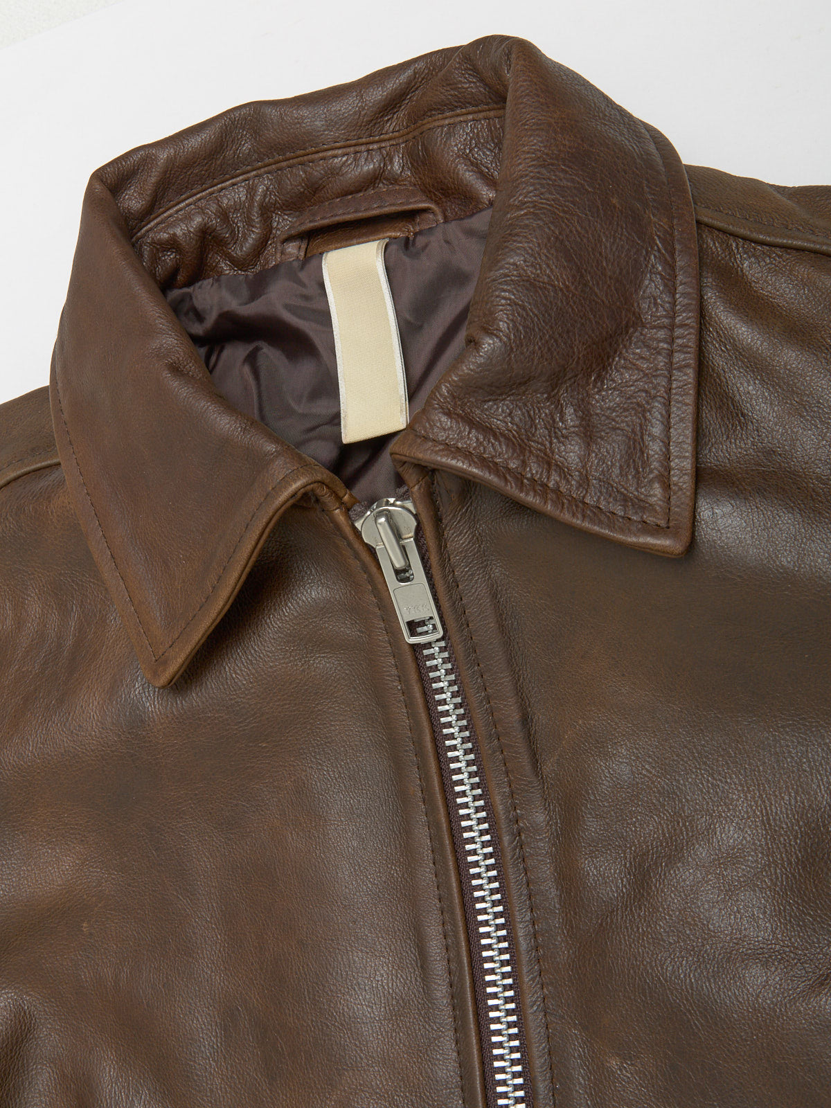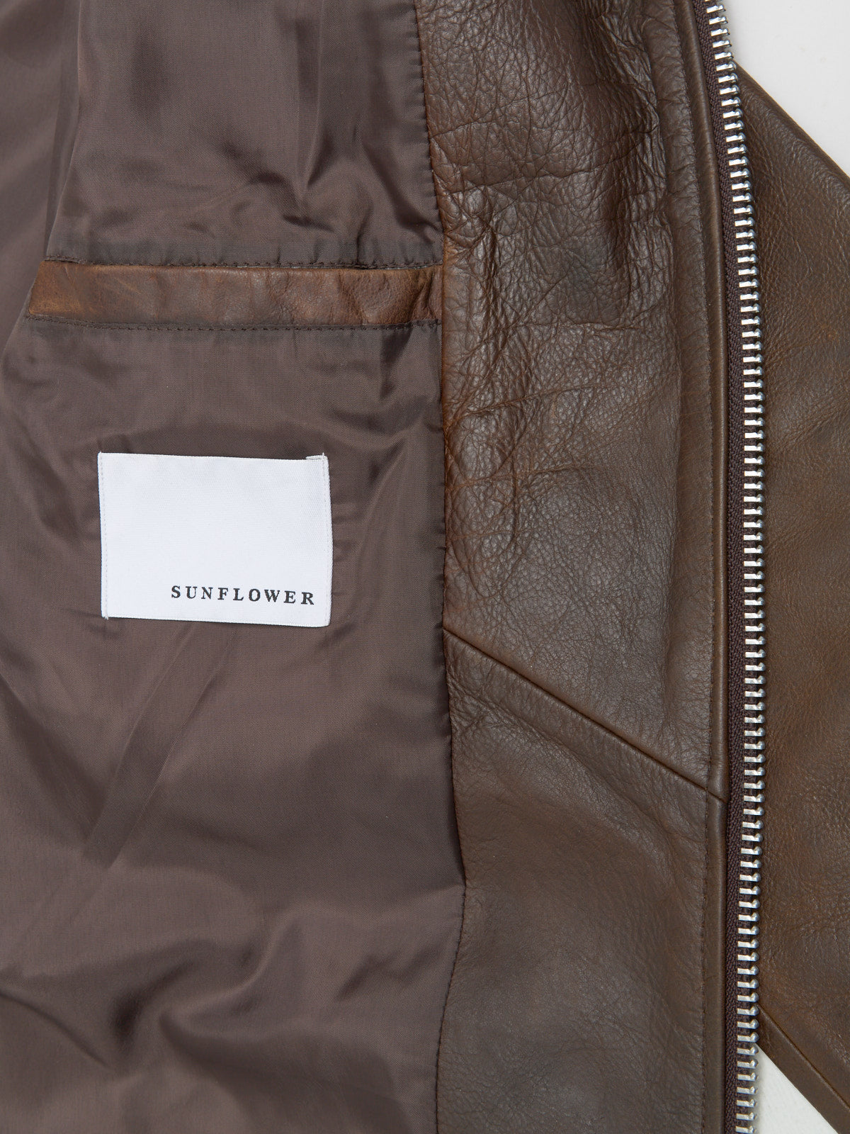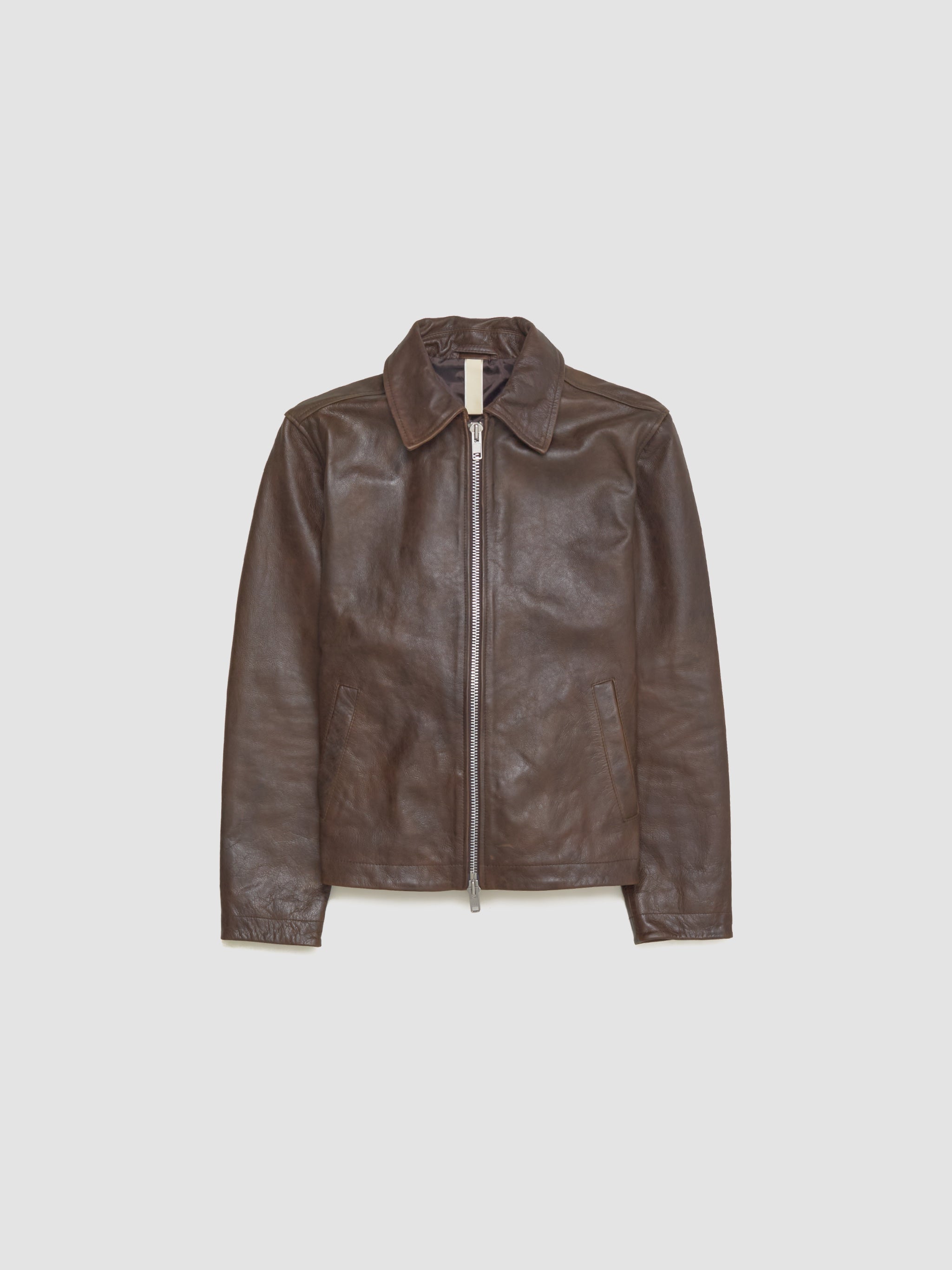 Sunflower Short Leather Jacket in Brown is made from 100% leather following a regular silhouette with a double sided zip-closure.