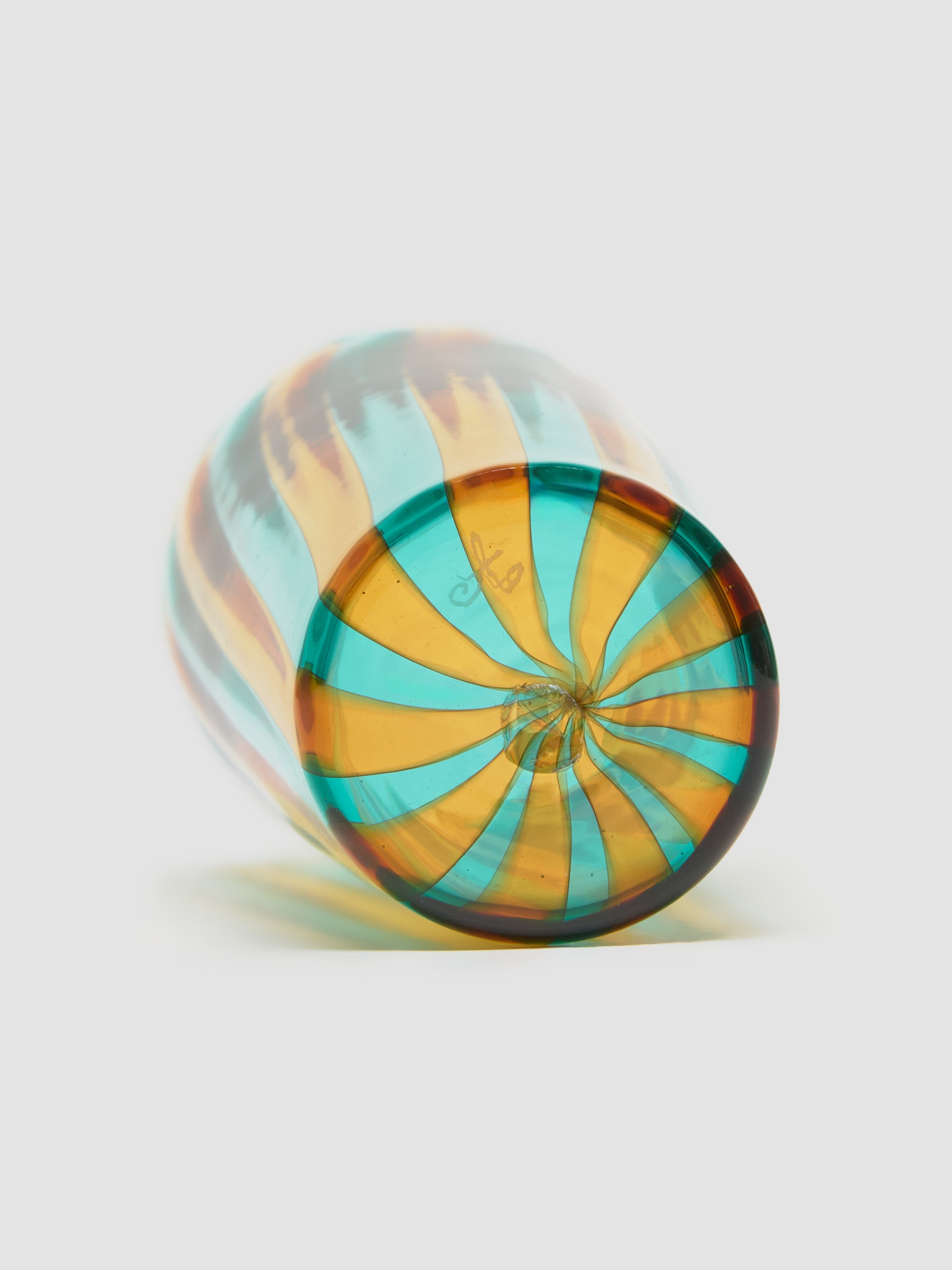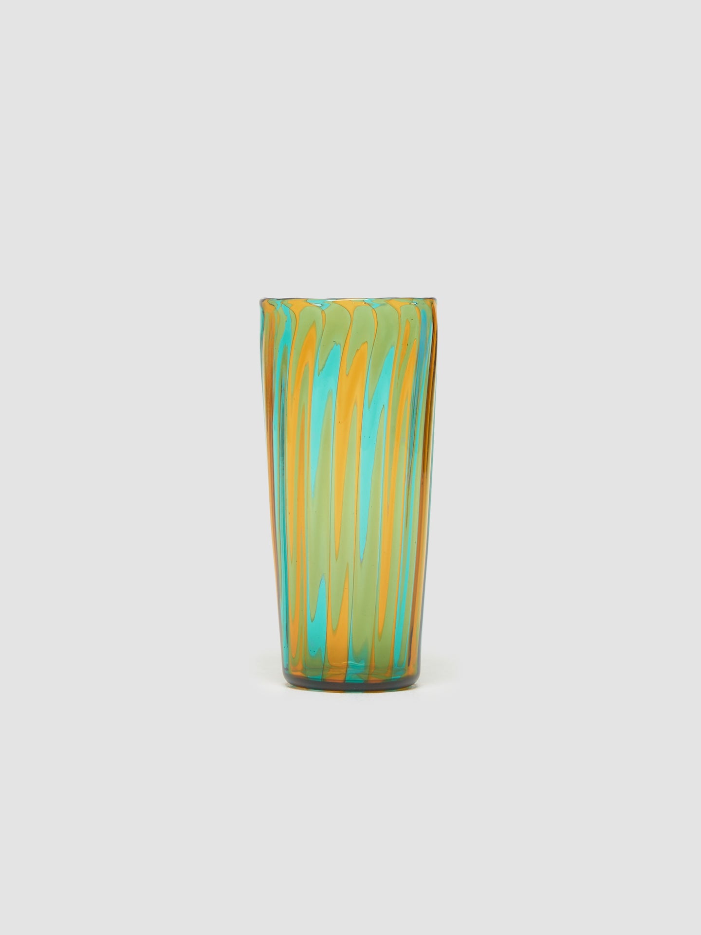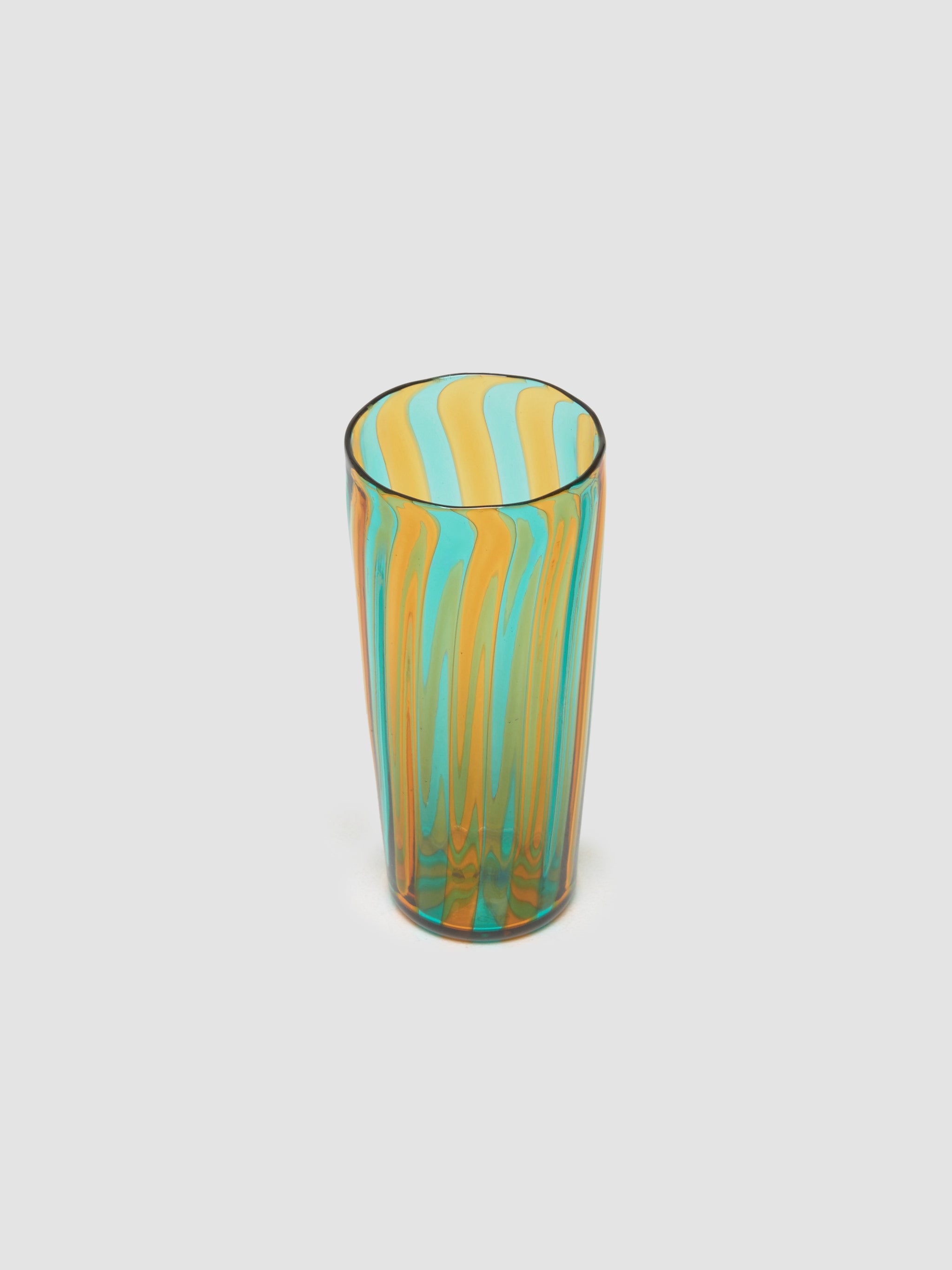 Akua Objects Augusta Large Glass in Aquamarine & Mustard is made from 100% mouth–blown glass featuring irregular striped design.