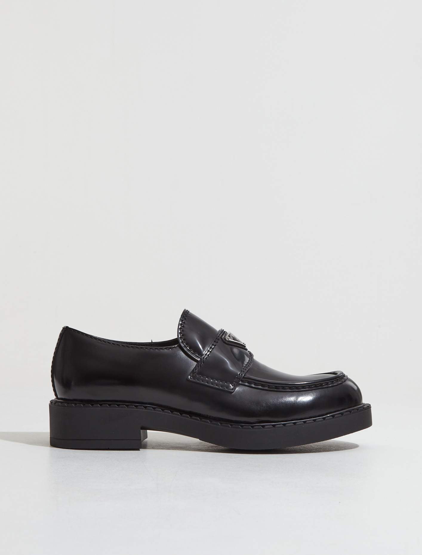 Prada Brushed Leather Loafers in Black are made from 100% leather following a classic loafer silhouette with a chunky rubber sole.