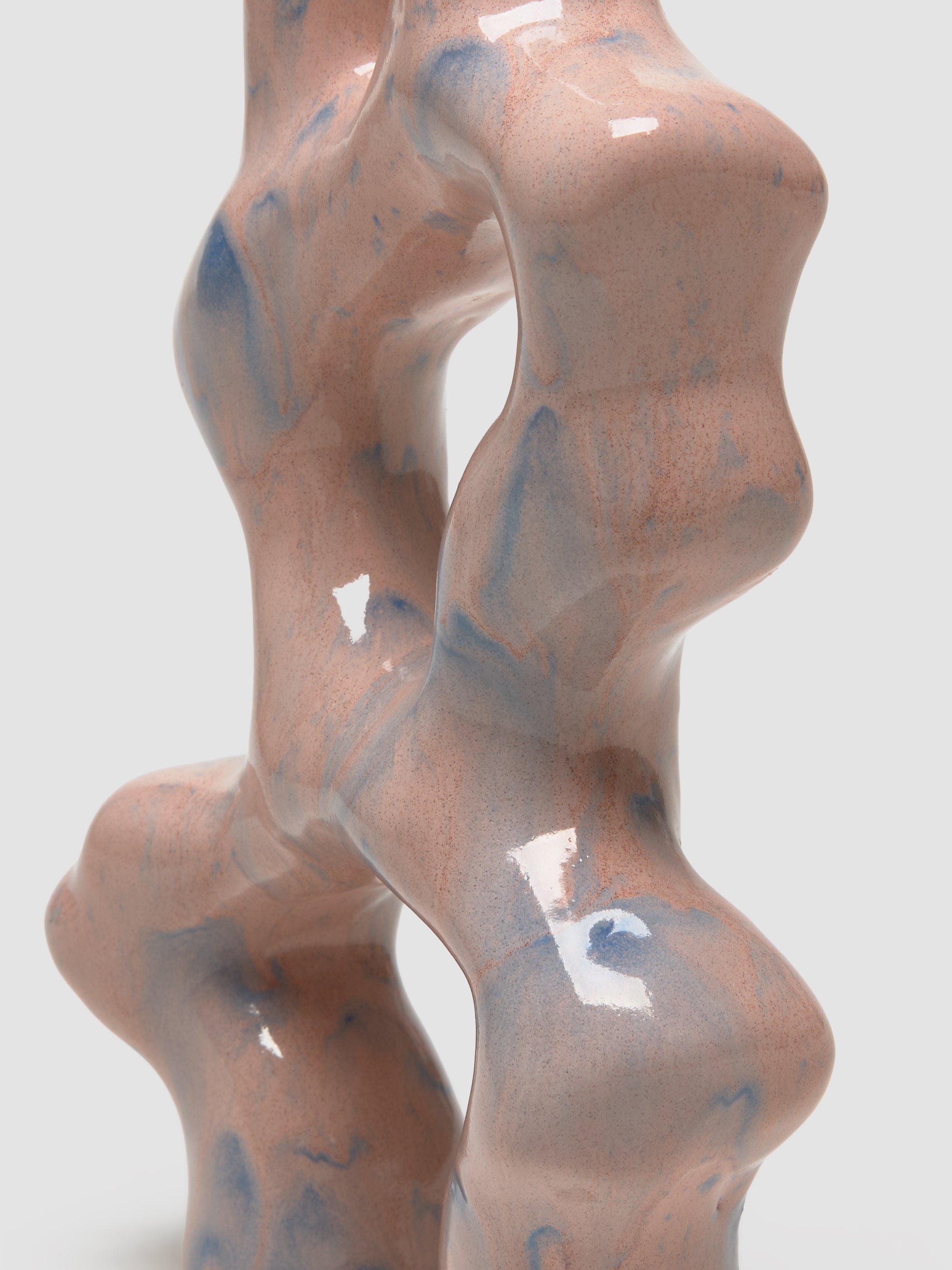 Tamara Romanova Double Candleholder in Candy Pink is made from stoneware ceramic, featuring an organic sculptural form with a glossy marbled finish.
