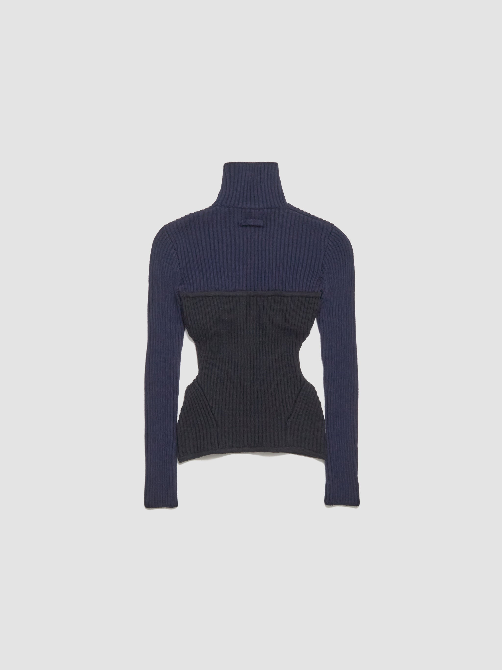Jean Paul Gaultier Wool Ribbed High Neck Sweater in Navy & Black is made from a wool blend following a fitted silhouette with a corset-inspired bodice.