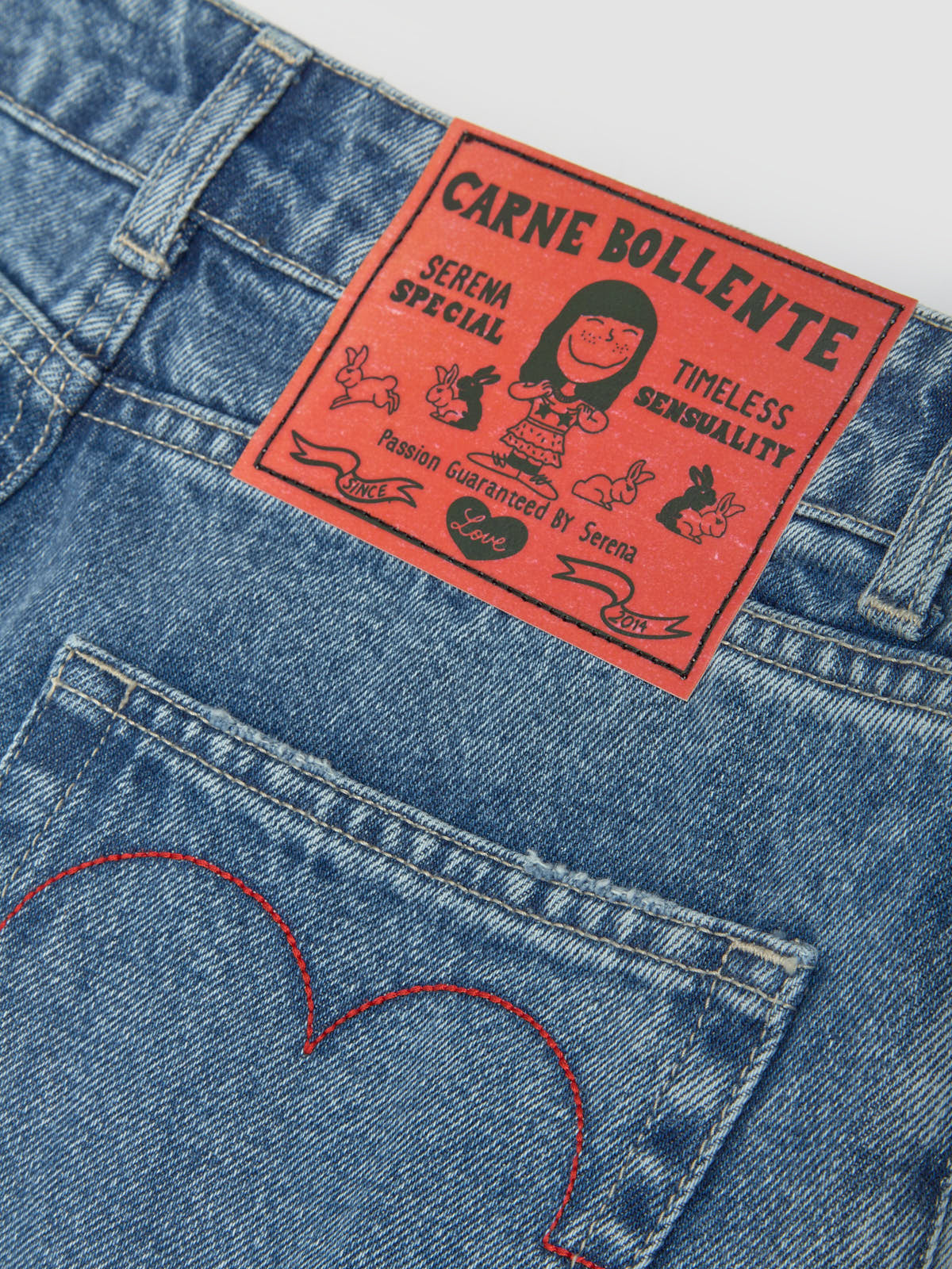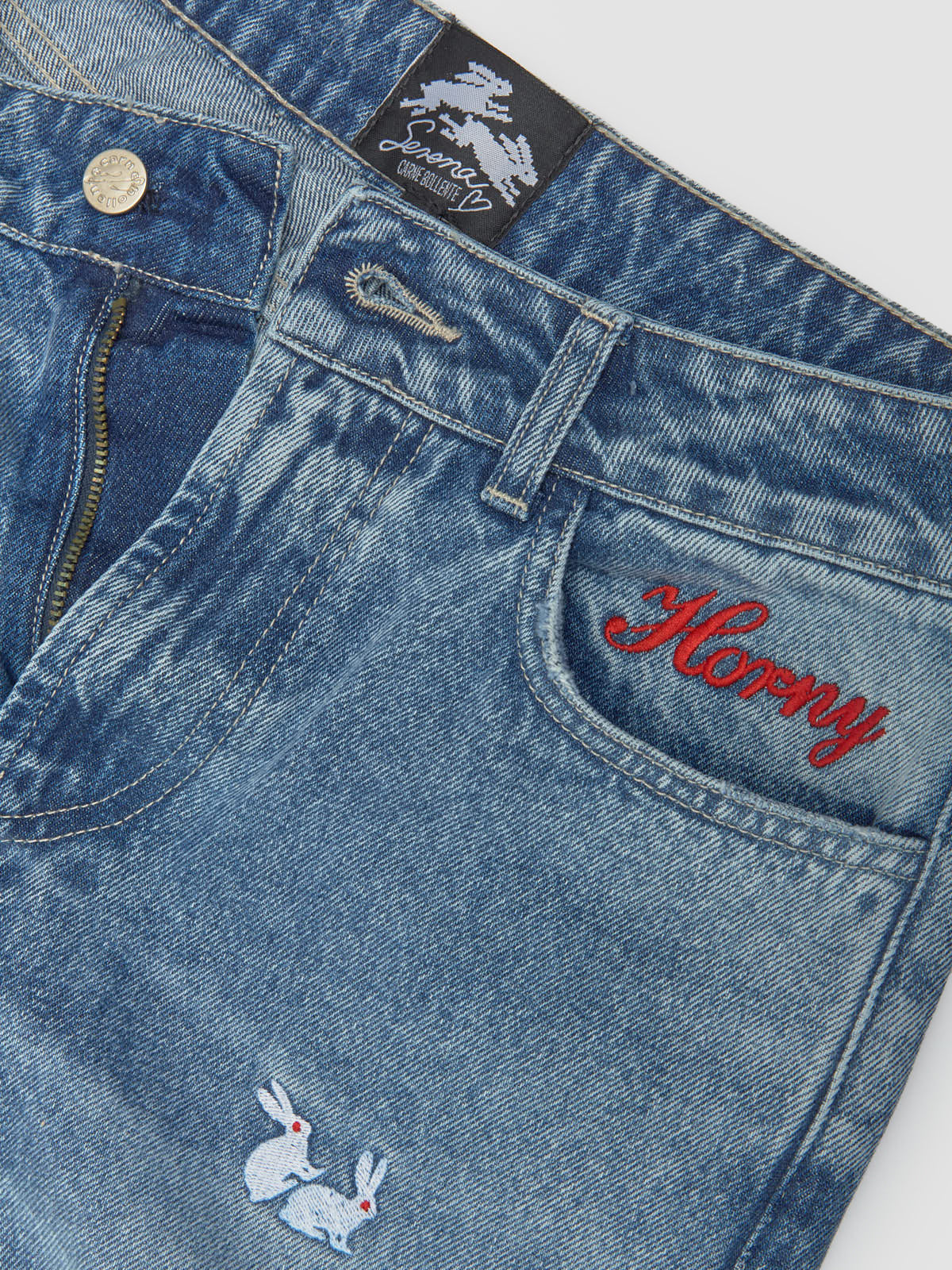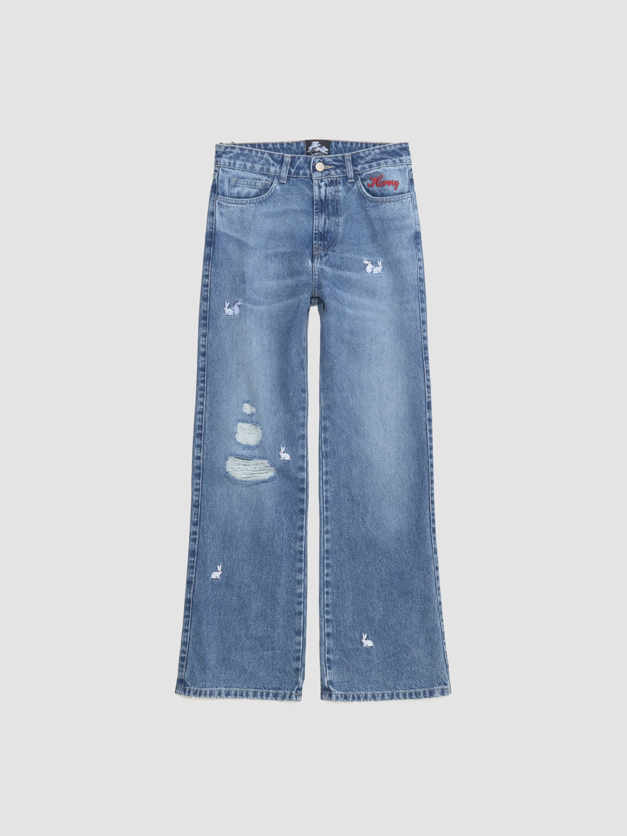 Carne Bollente Bell-Bottom Bunny Jeans in Off Blue are made from 100% cotton following a straight silhouette with all-over embroidery details.