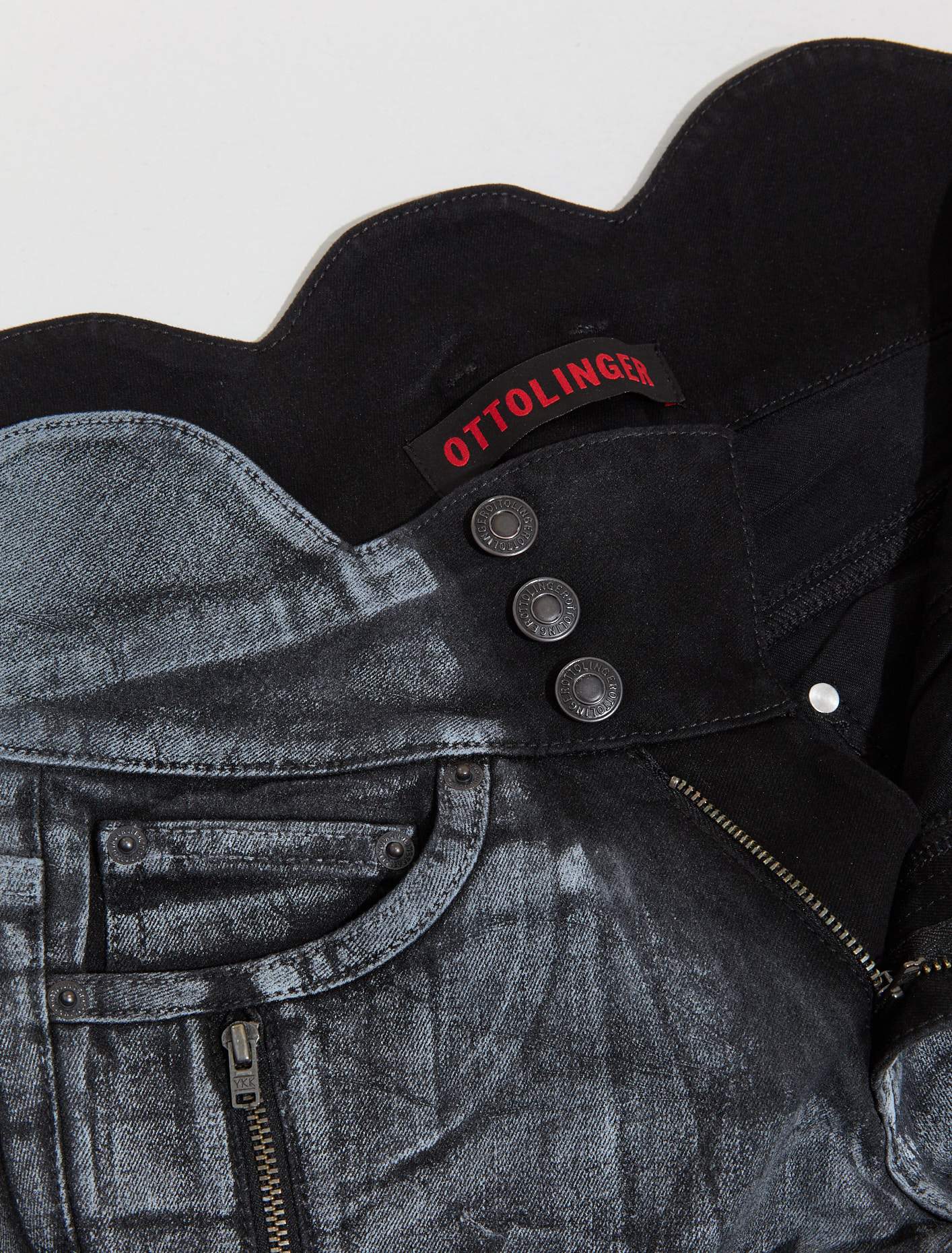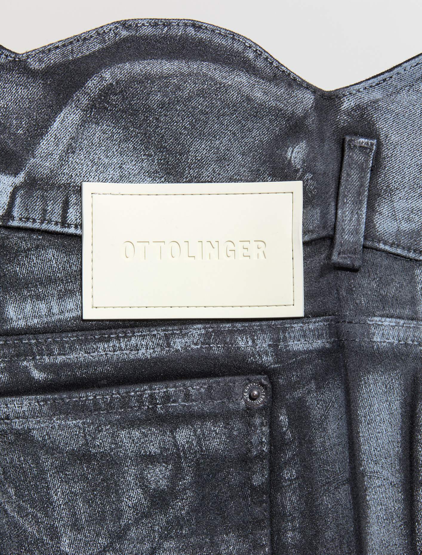 OTTOLINGER Big Waistband Drape Denim Pants in Black & White Paint are made from a stretch cotton blend following a draped silhouette.