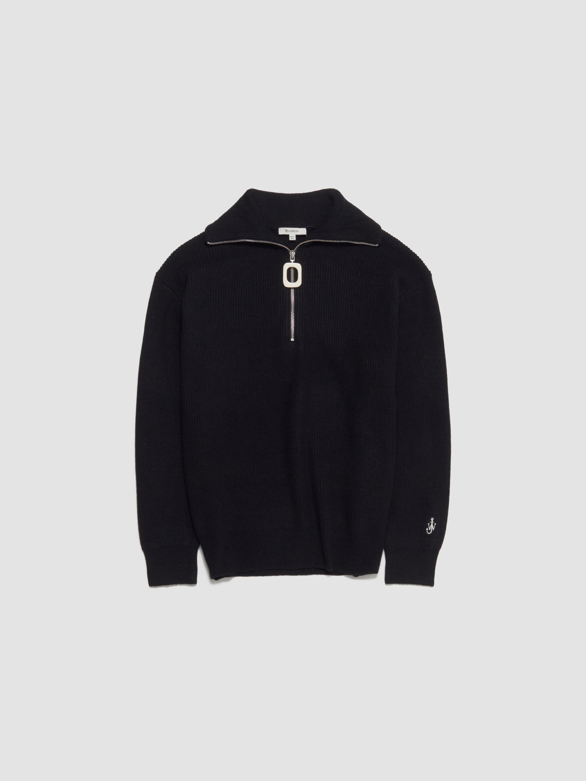 JW Anderson Half Zip Jumper in Black is made from a cotton blend following a relaxed silhouette with a half-zip closure and signature ring puller.