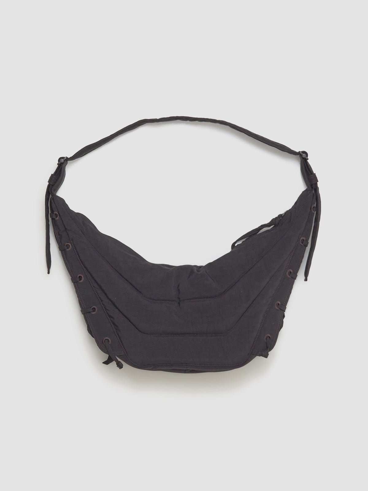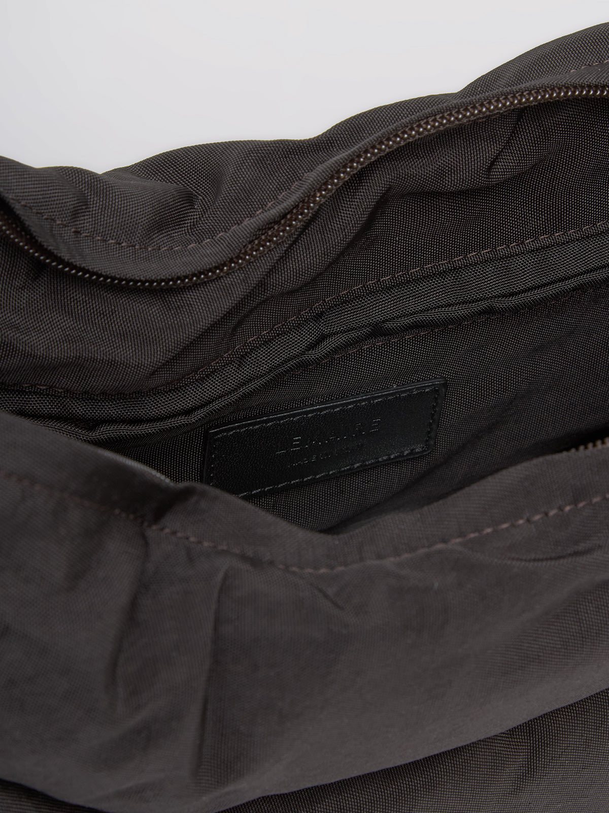 Lemaire Medium Soft Game Bag in Dark Chocolate is made from 100% polyamide featuring embroidered eyelets and matching laces.