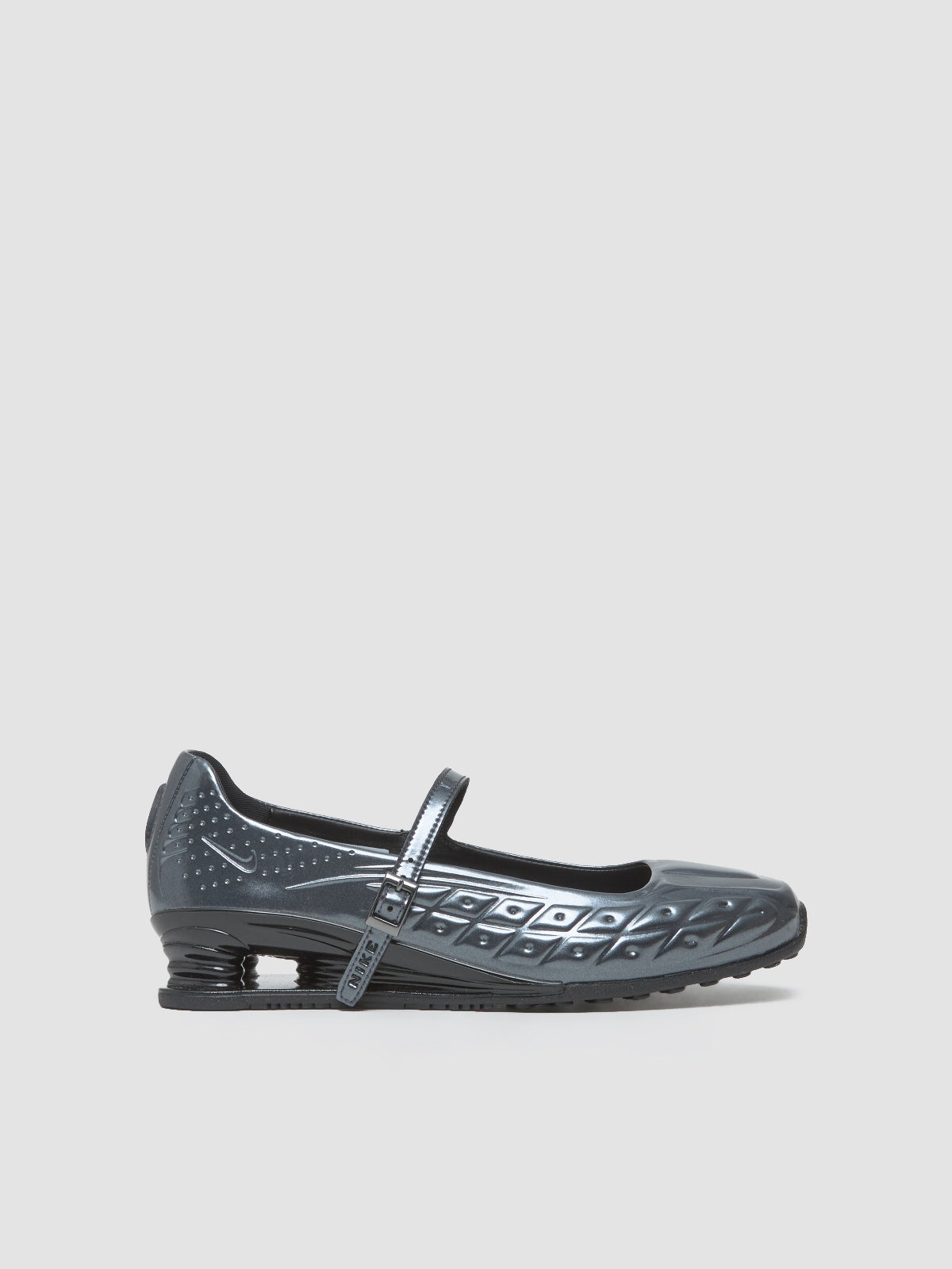 Inspired by wet Copenhagen pavement, Nike x NAKED Copenhagen Shox Z Calistra features a high-shine finish. The upper is constructed in molded patent synthetic leather. It includes a molded sockliner and metal strap hardware. Finished with NAKED-branded sockliner detailing.