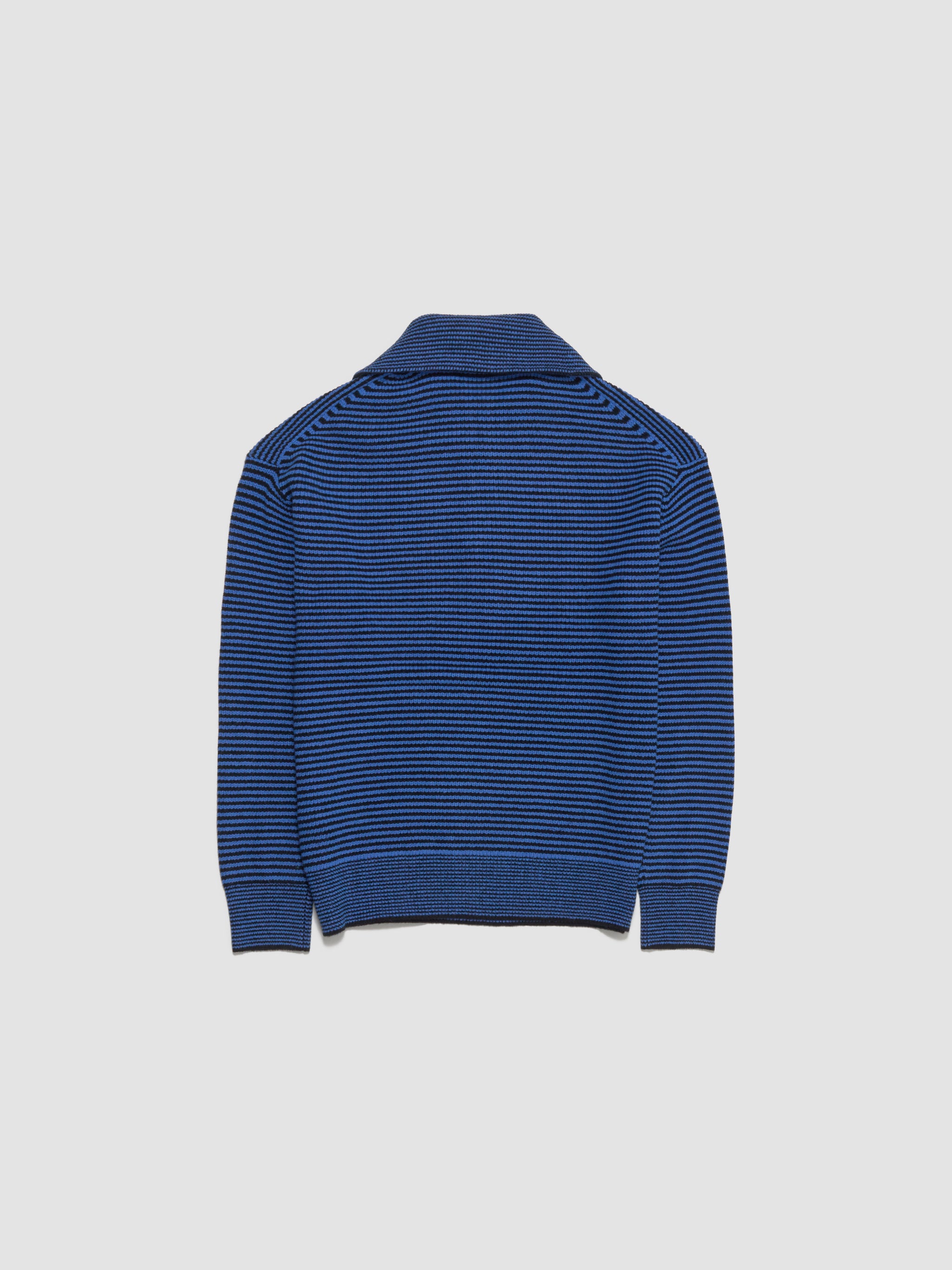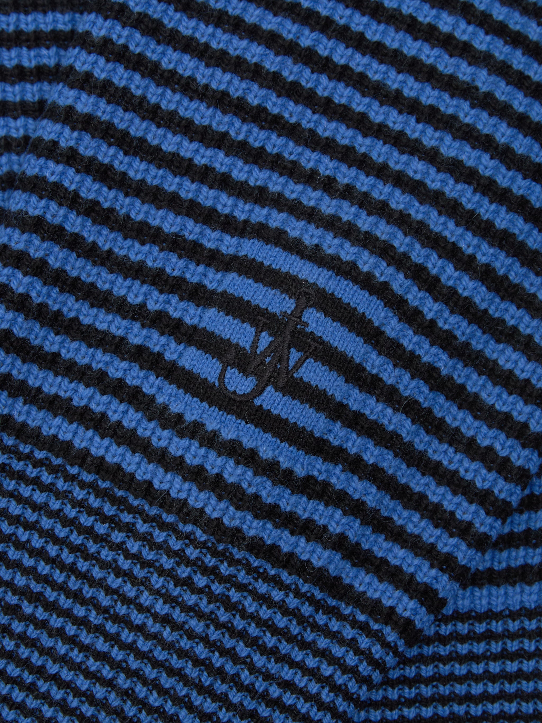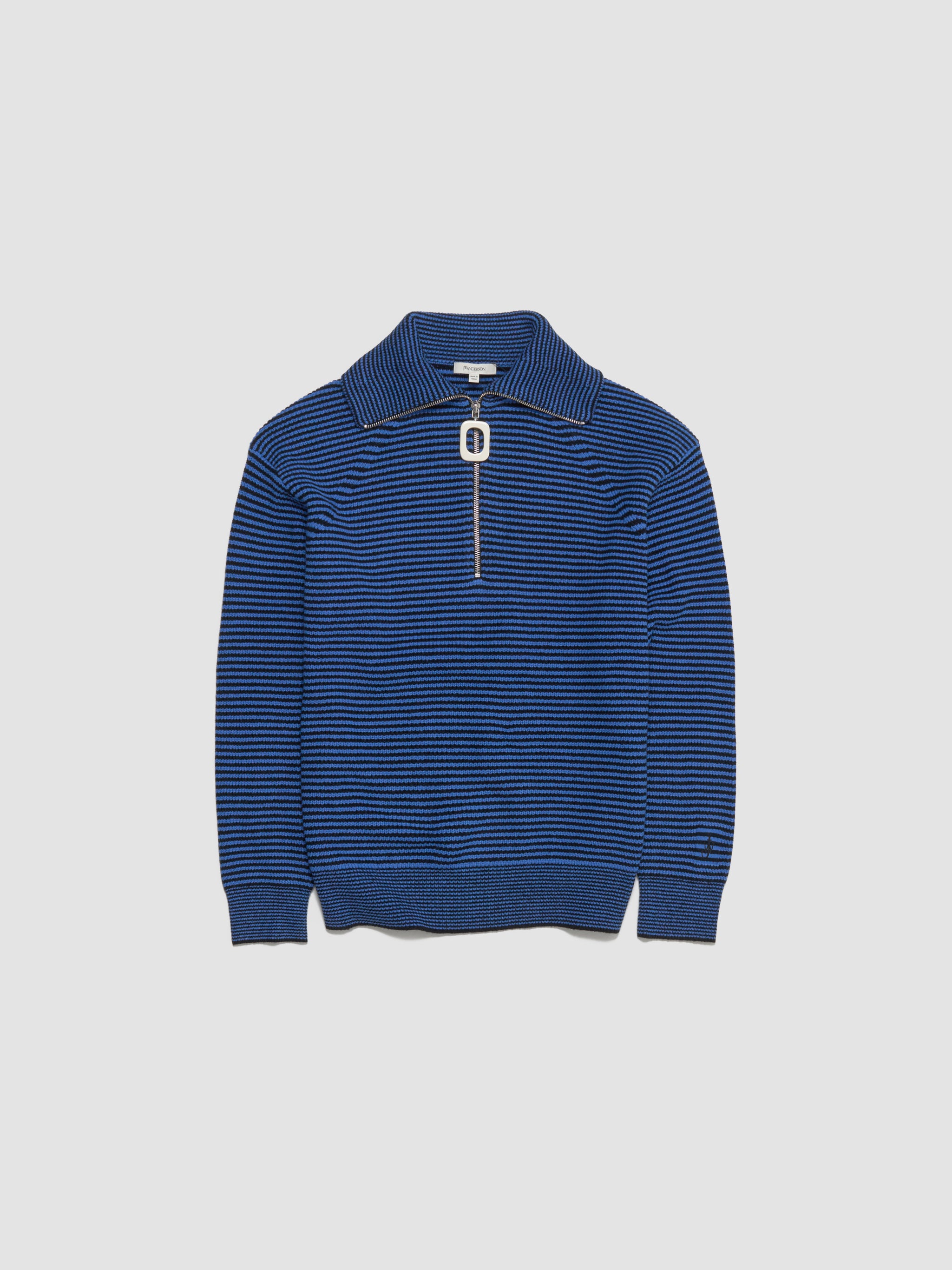 JW Anderson Half Zip Jumper in Blue & Black is made from a cotton blend following a relaxed silhouette with half-zip closure and signature ring puller.