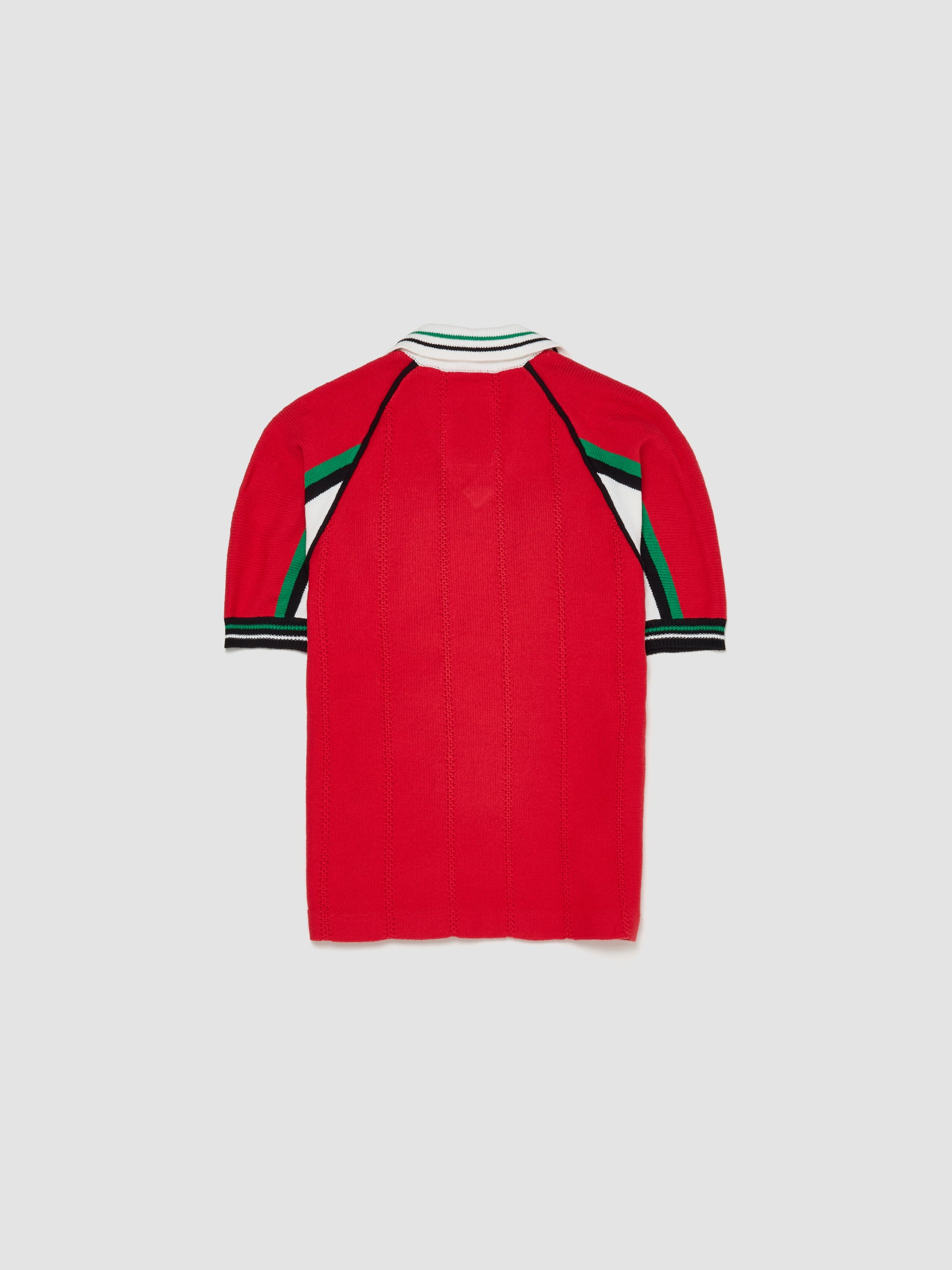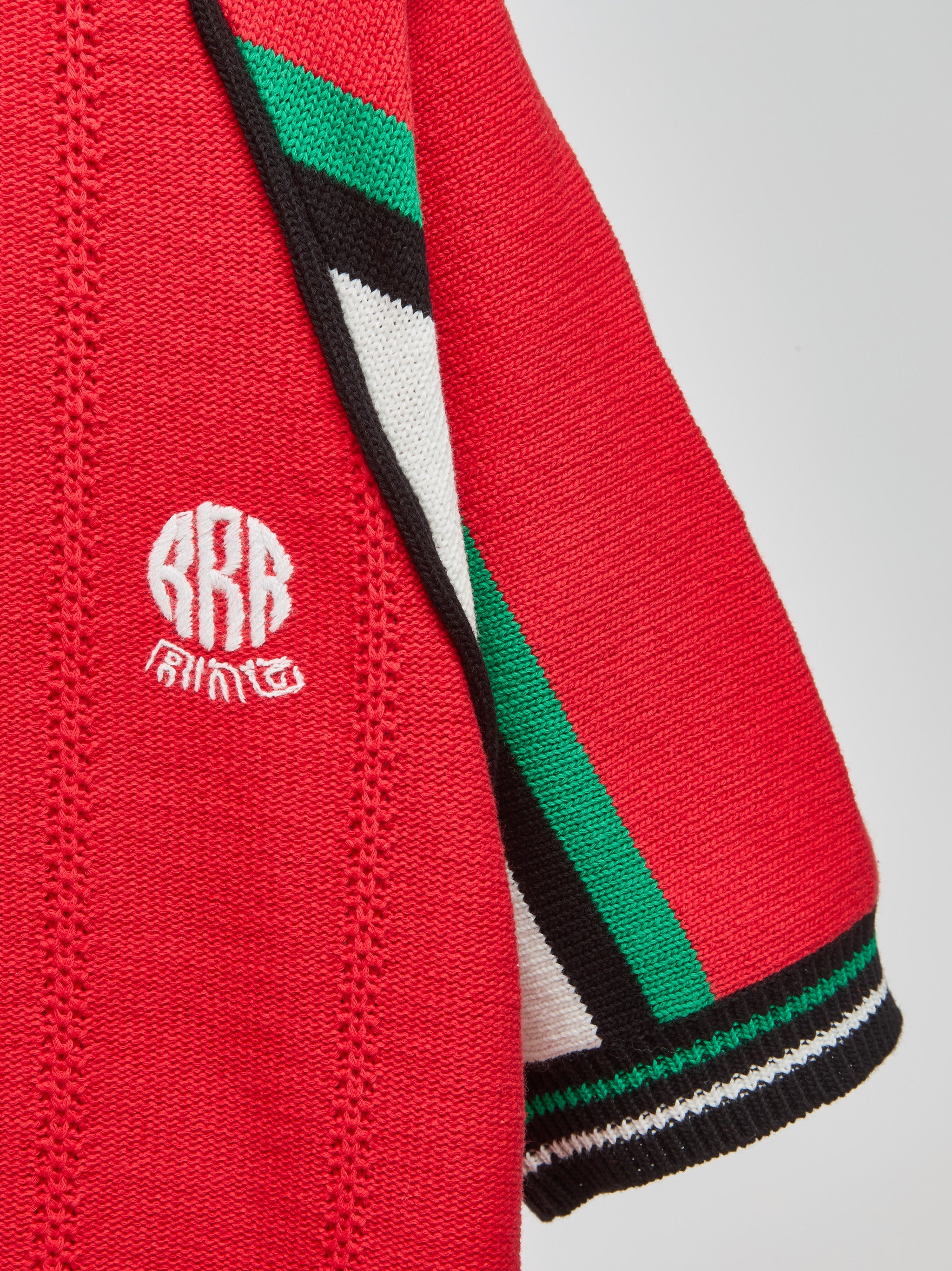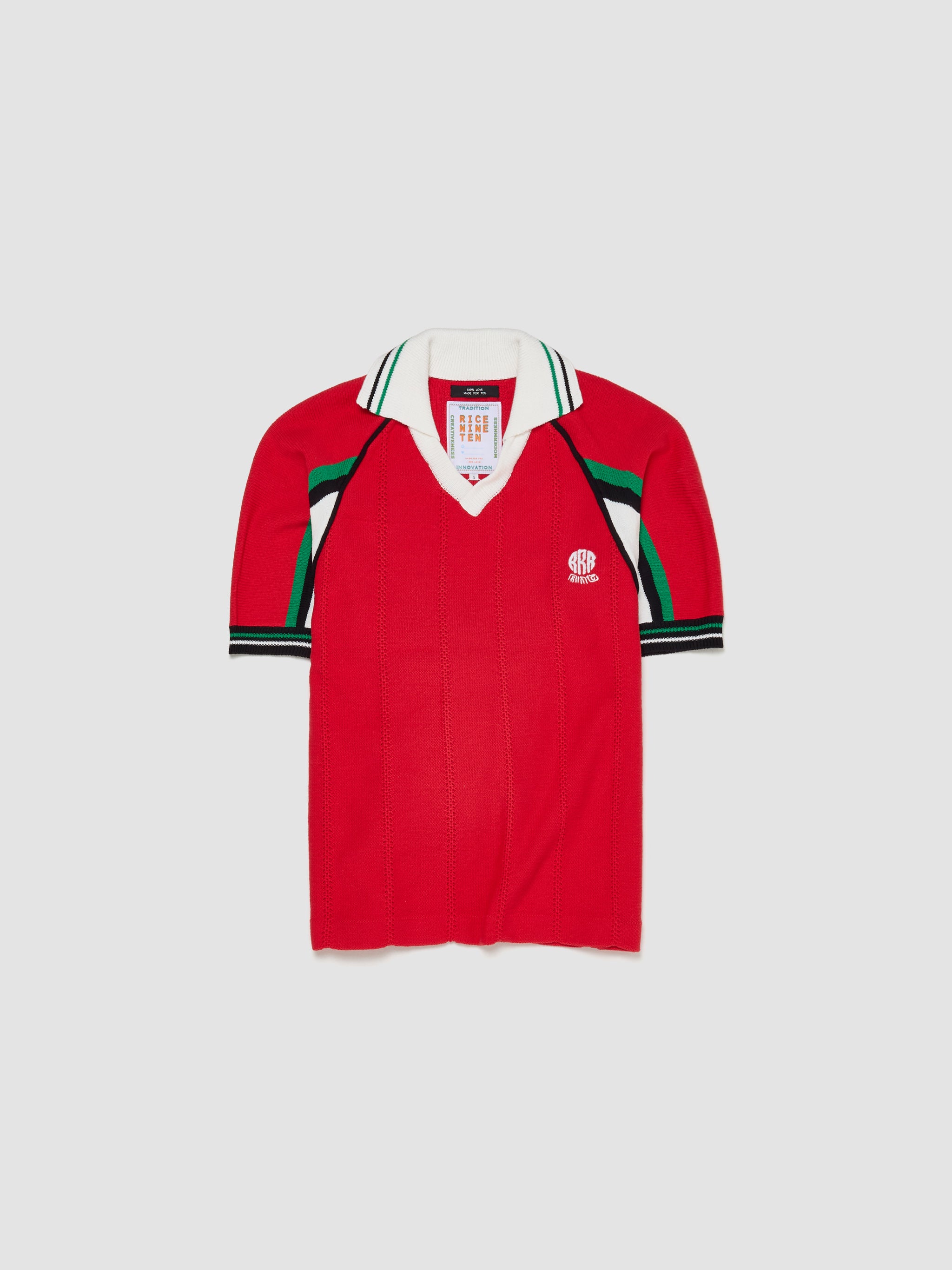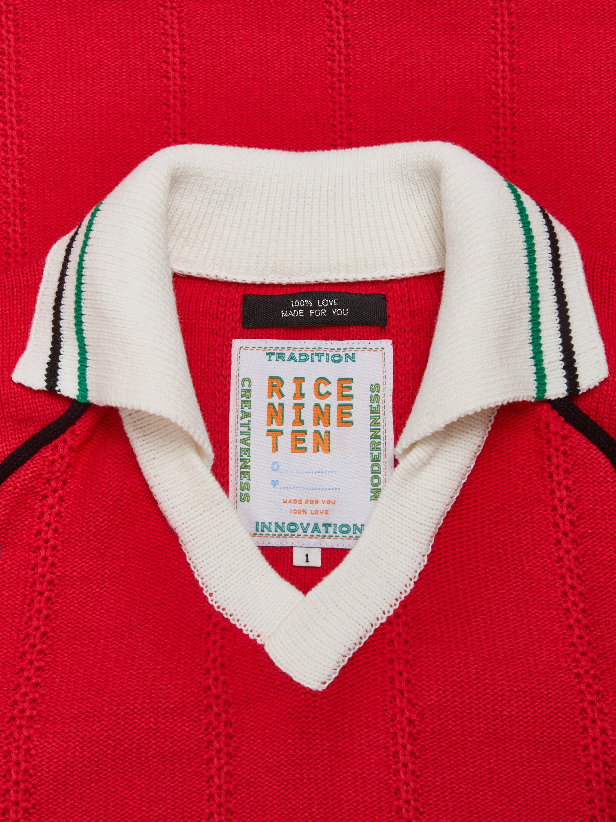 RICE NINE TEN Knitting Soccer Jersey in Red is made from 100% cotton following a relaxed fit with a logo embroidery in the front.