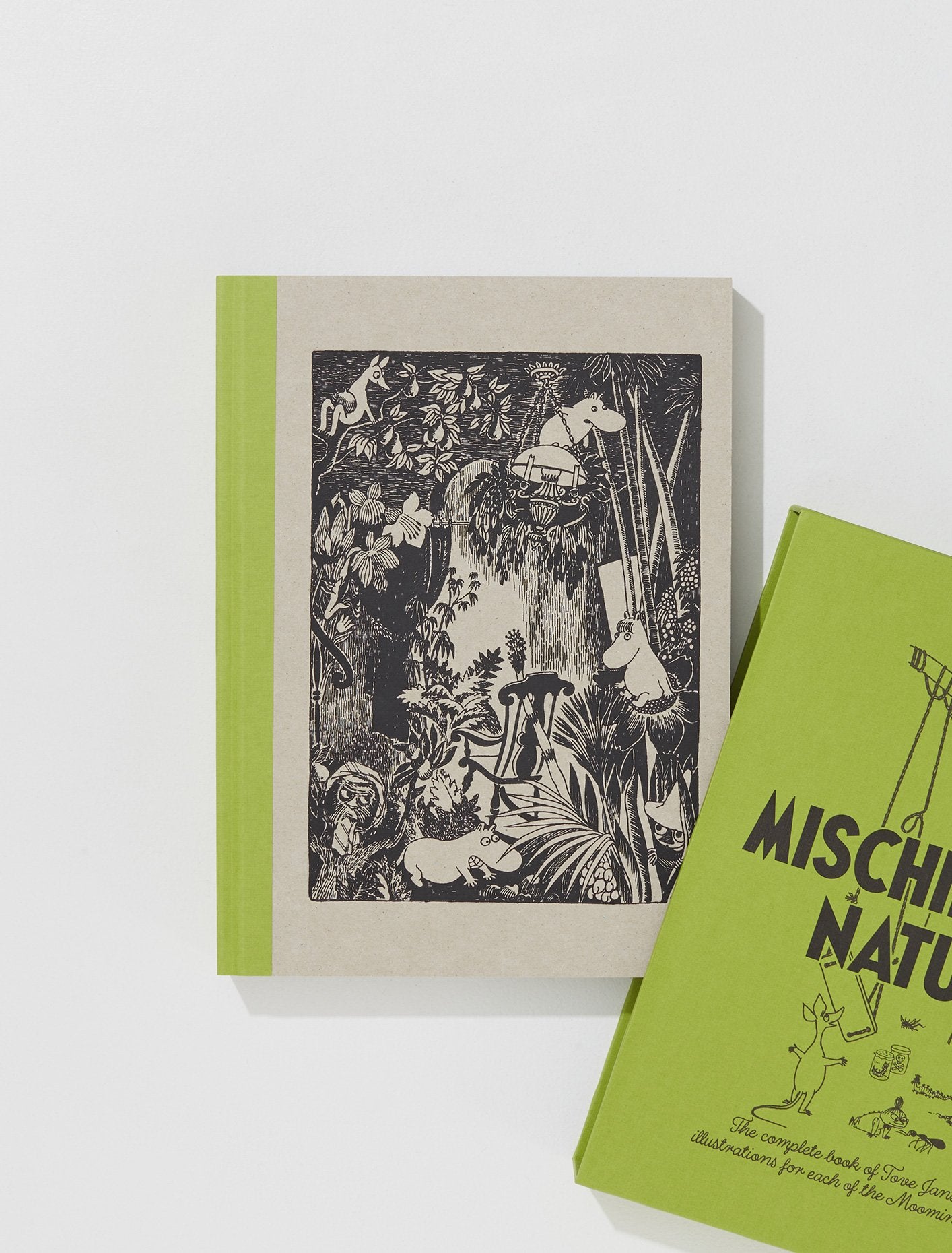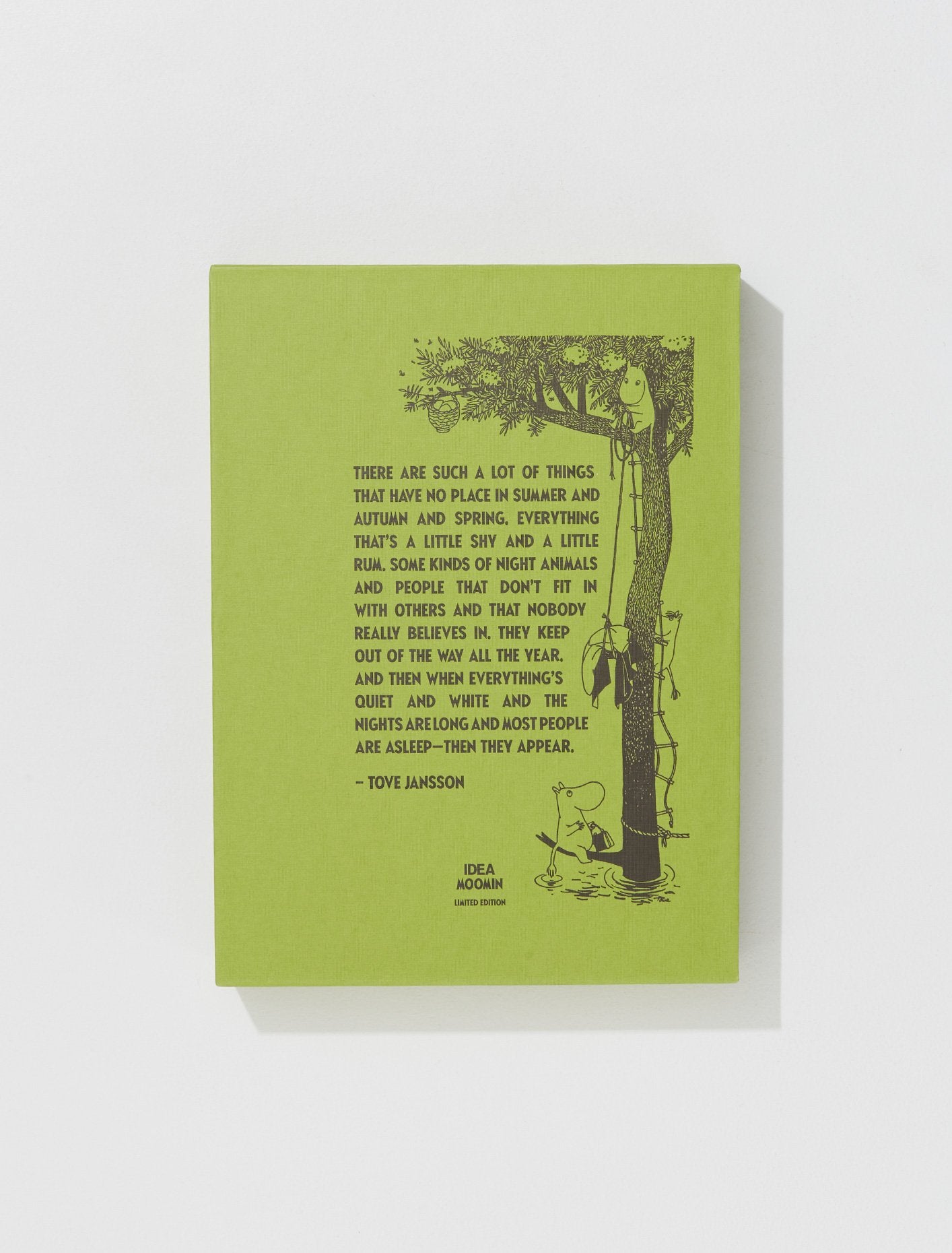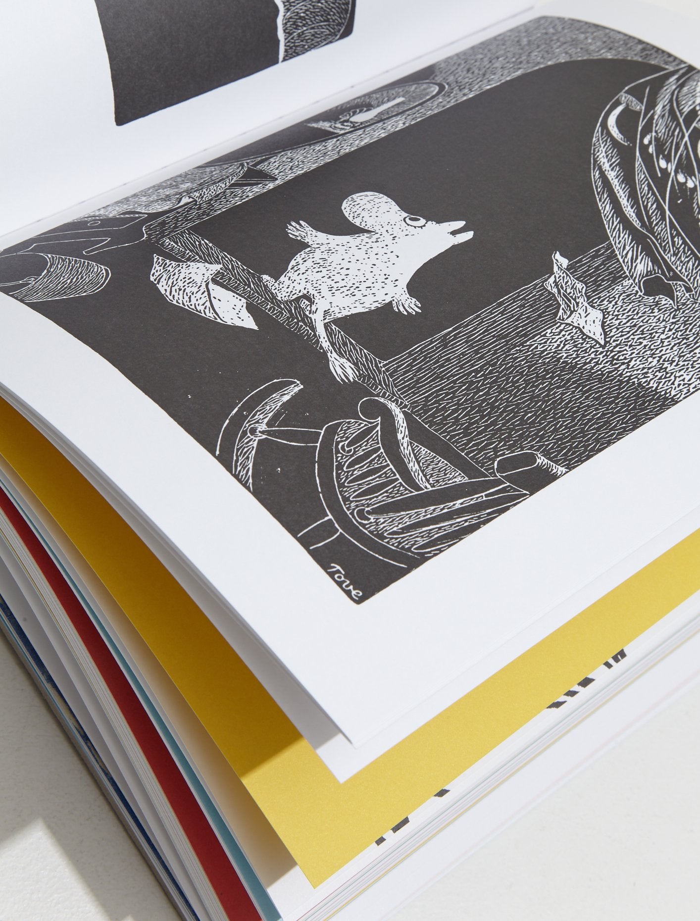 The complete book of Tove Jannson illustrations for each of the Moomin novels. Screenprinted and flush–cut Eskaboard cover in green slipcase with foiled title 30 x 22 cm 280 pages 8 fold–out gloss pages of novel covers Cardboard magnifier Folded poster of Moomin maps