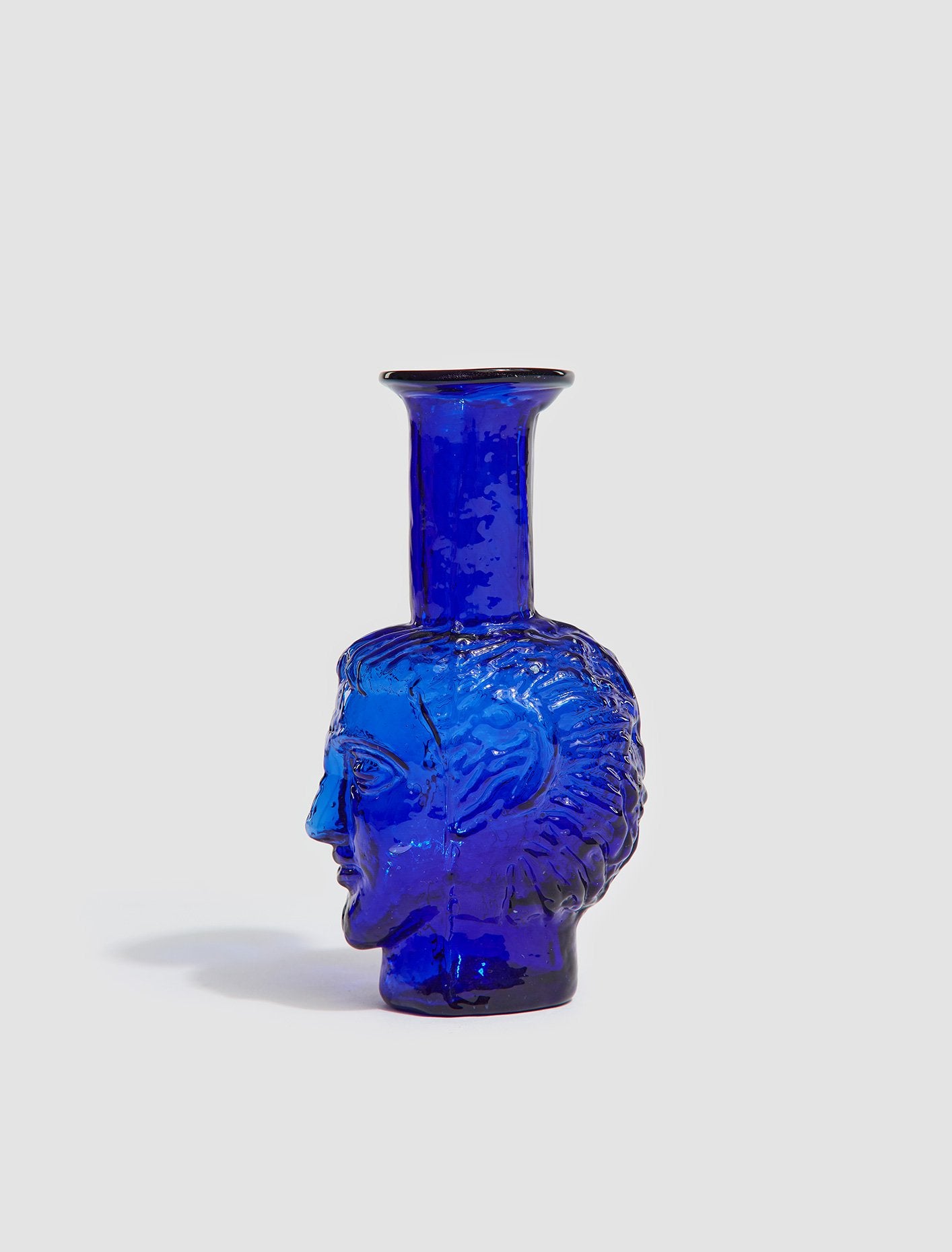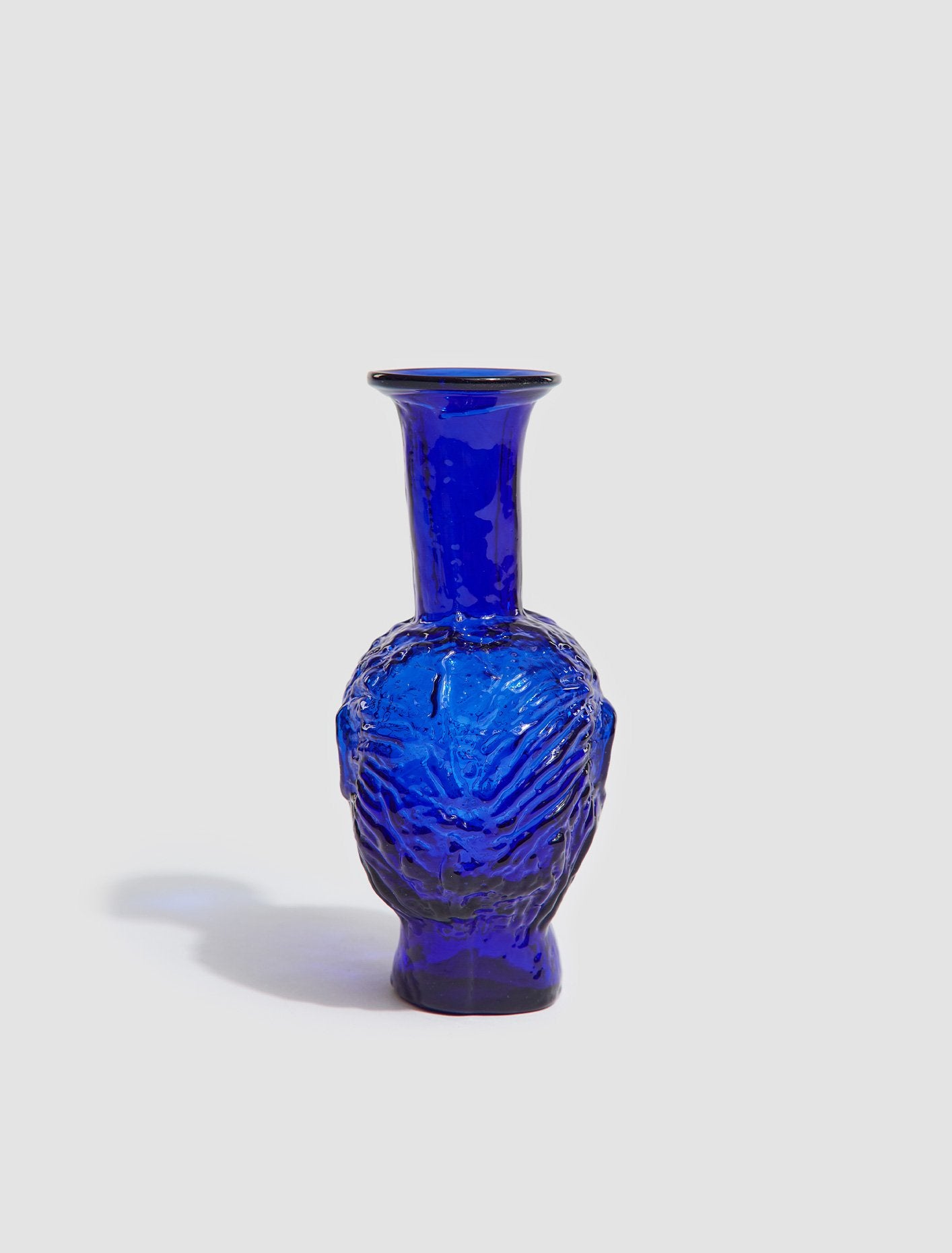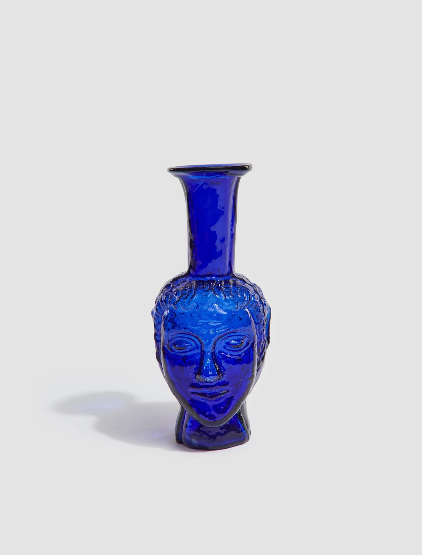 La Soufflerie Tête Vase in Blue is made in Paris from 100% mouth blown recycled glass with a face–shaped body and tubular neck.