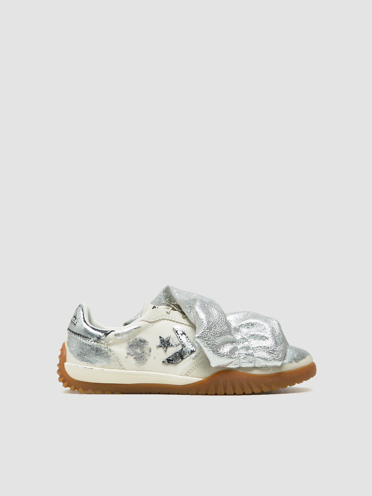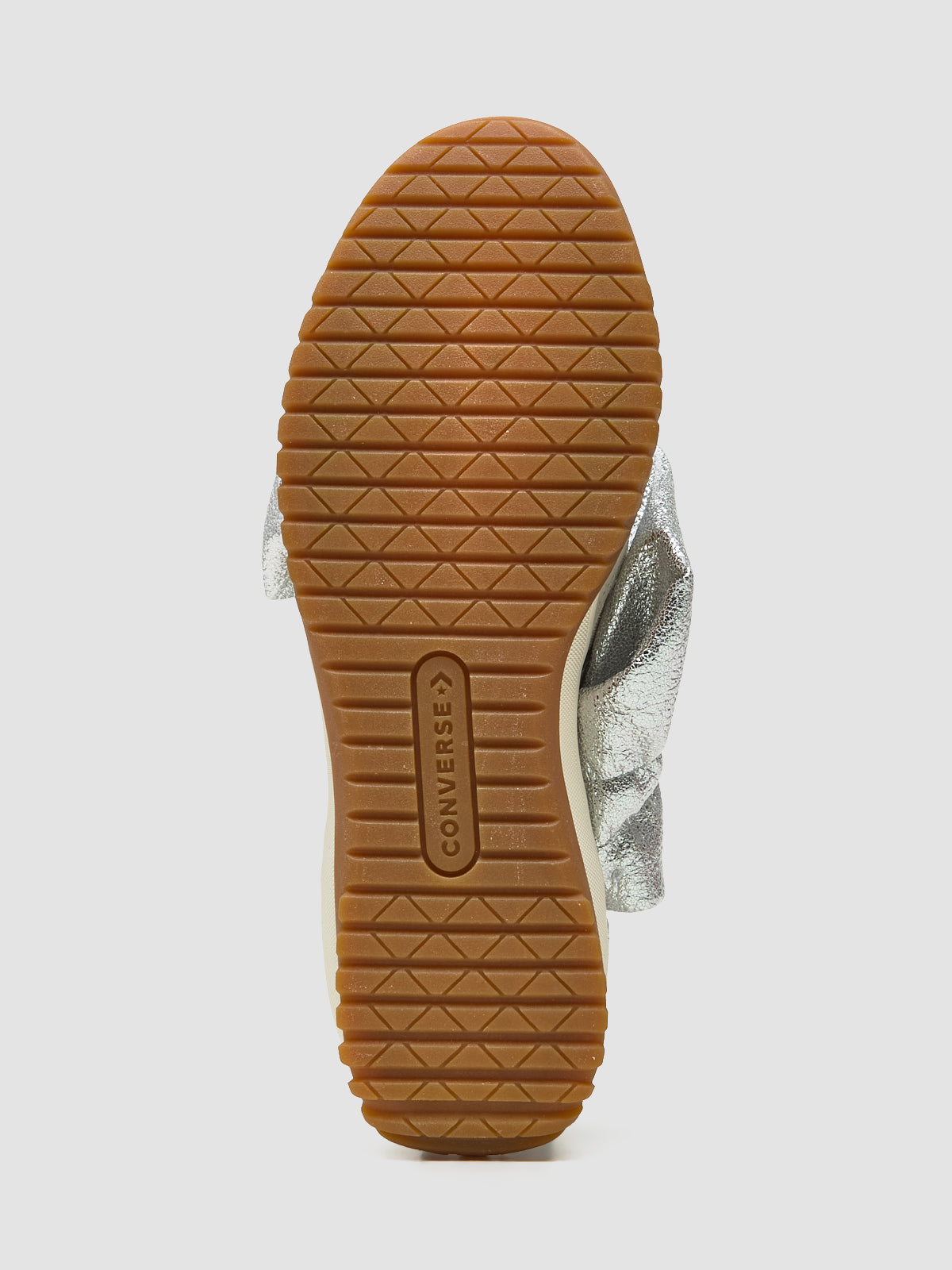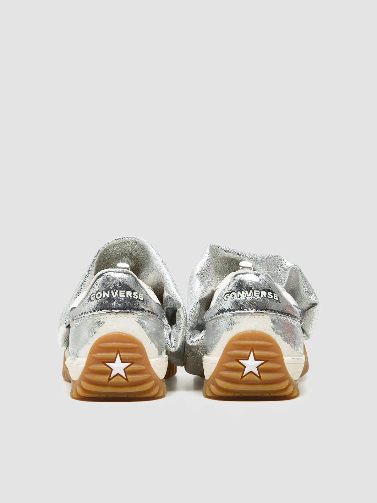 Converse Run Star Trainer Ltd in Metal Silver Ruffle features suede upper and rubber sole following silver stitching, ruffles, and foil details.