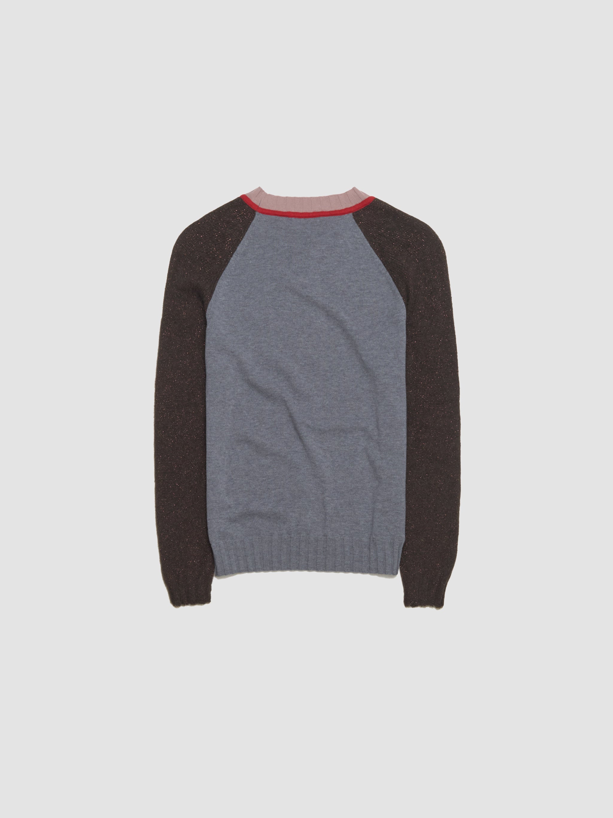 Edward Cuming Jock In The Closet Sweater in Grey & Brown is made from 100% wool following a regular silhouette with contrast knit sleeves.