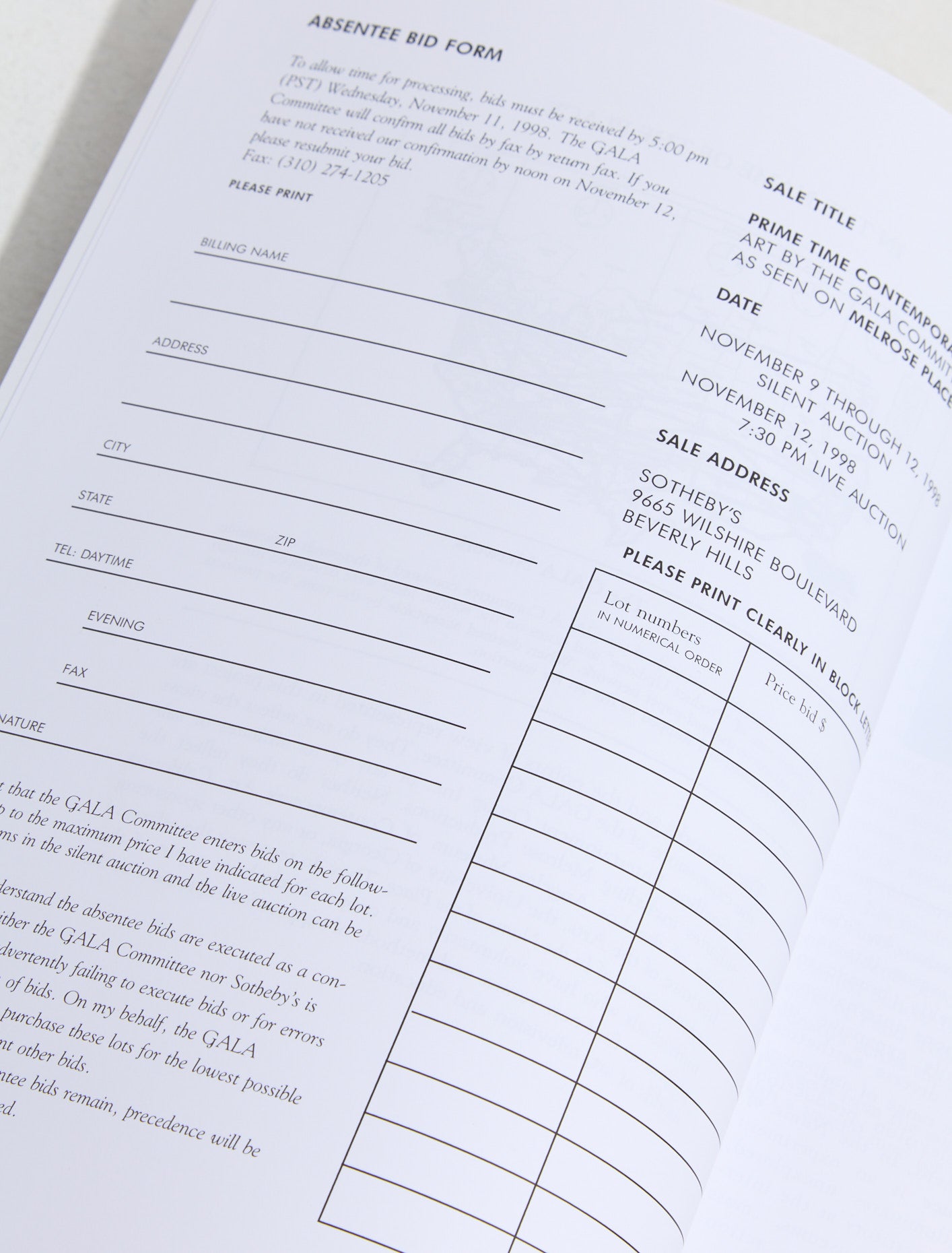 Primetime Contemporary Art is a publication documenting a radical, two–year intervention by the GALA Committee on the primetime television show Melrose Place. Originally published in a limited run in 1998, this extremely rare artist book is reproduced here for the first time as a facsimile edition.