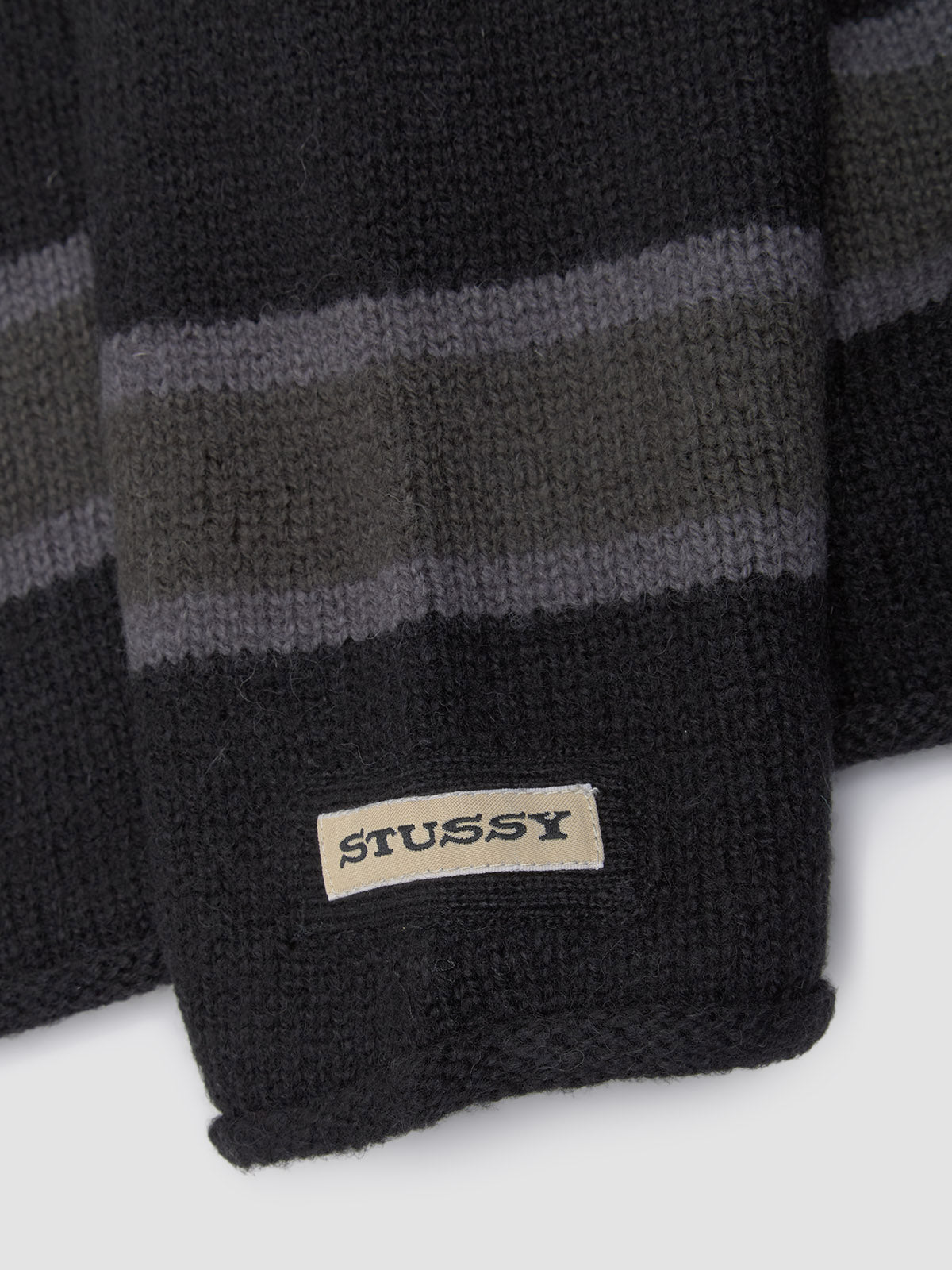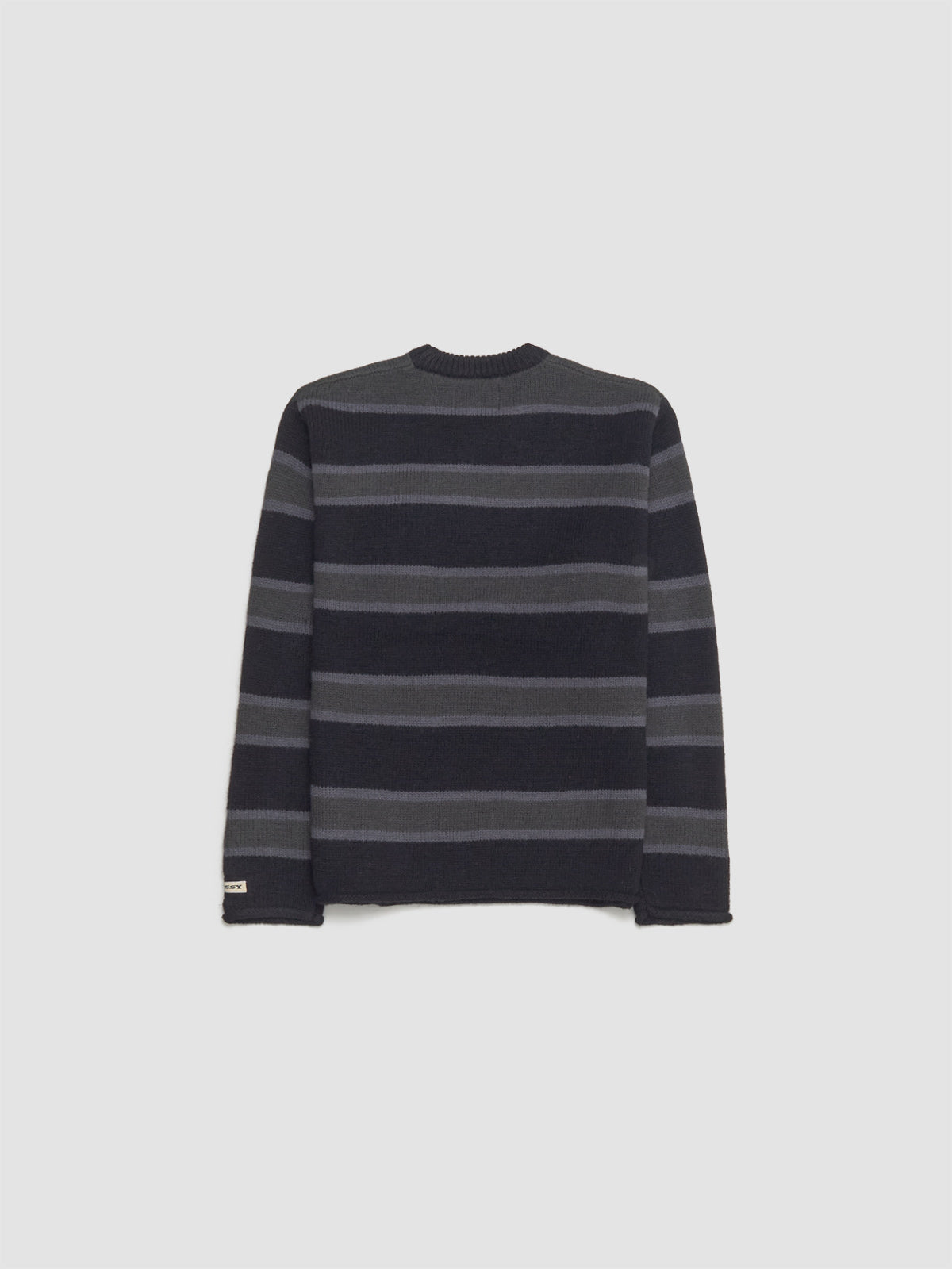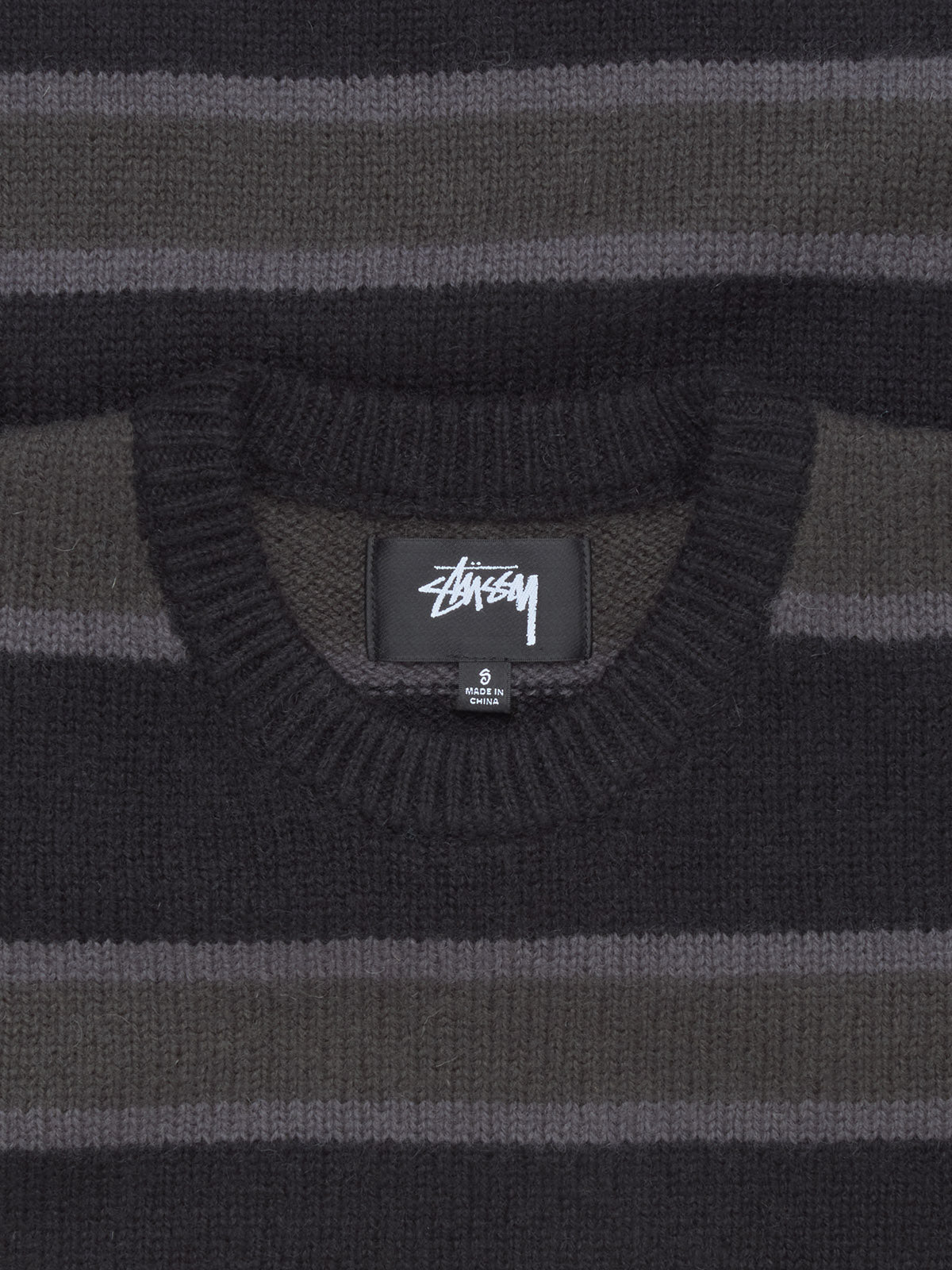 Stüssy Striped Wool Sweater in Black is made from 100% wool following a relaxed silhouette with rolled edges at cuffs and hem.