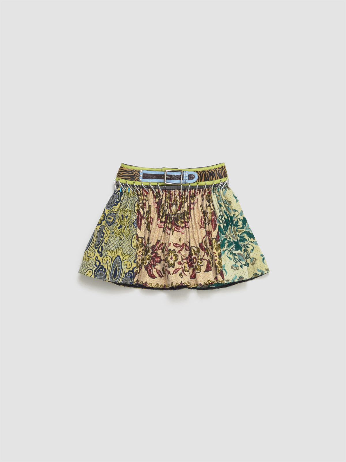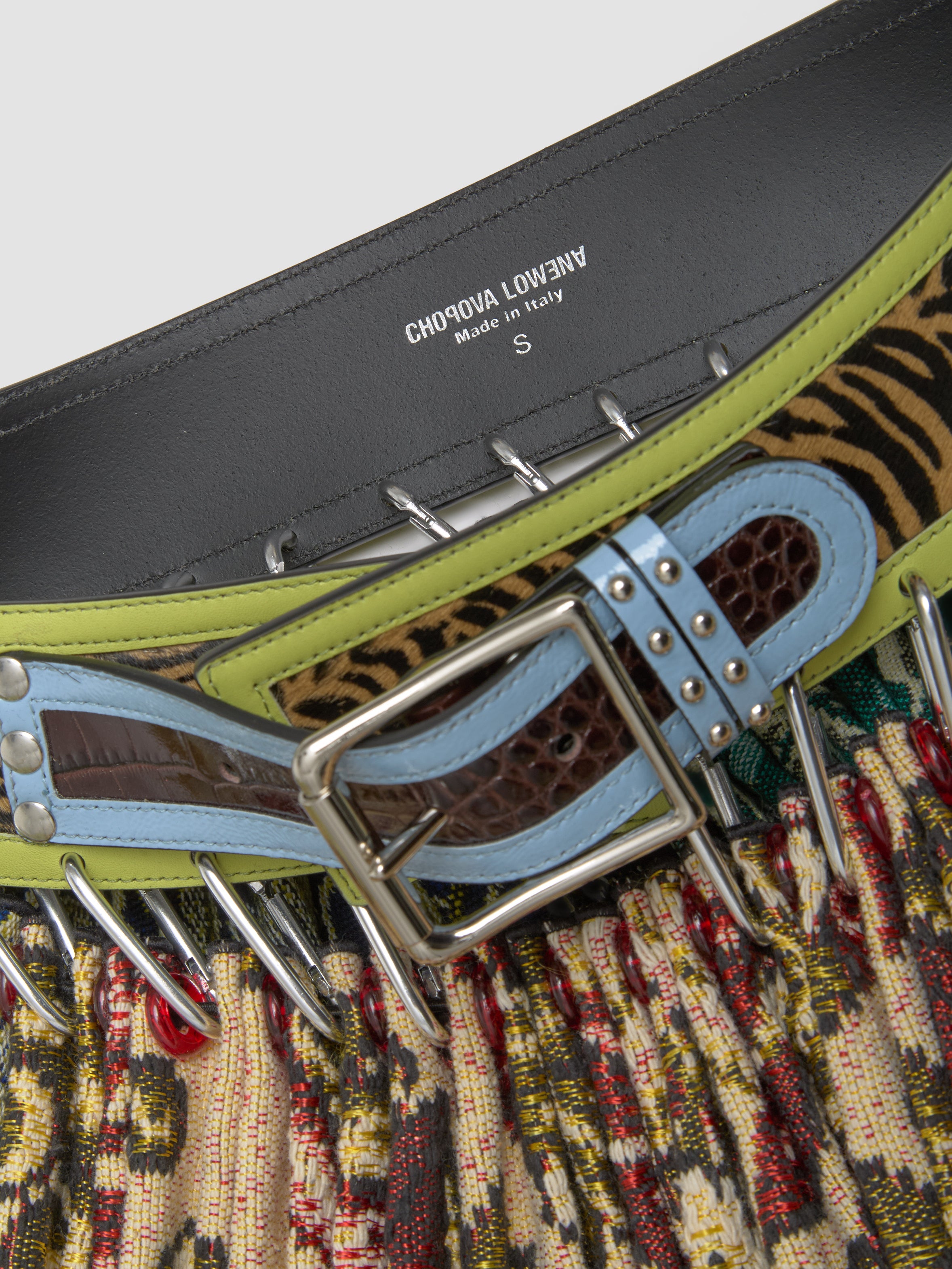 Chopova Lowena Blanket Mini Carabiner Skirt in Multi is made from 100% wool featuring a cowhide leather belt with buckle fastening.