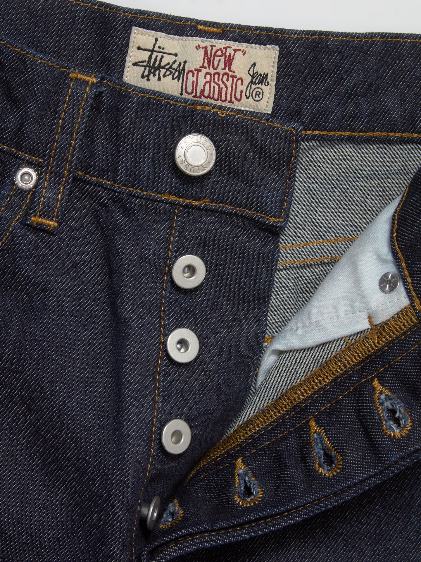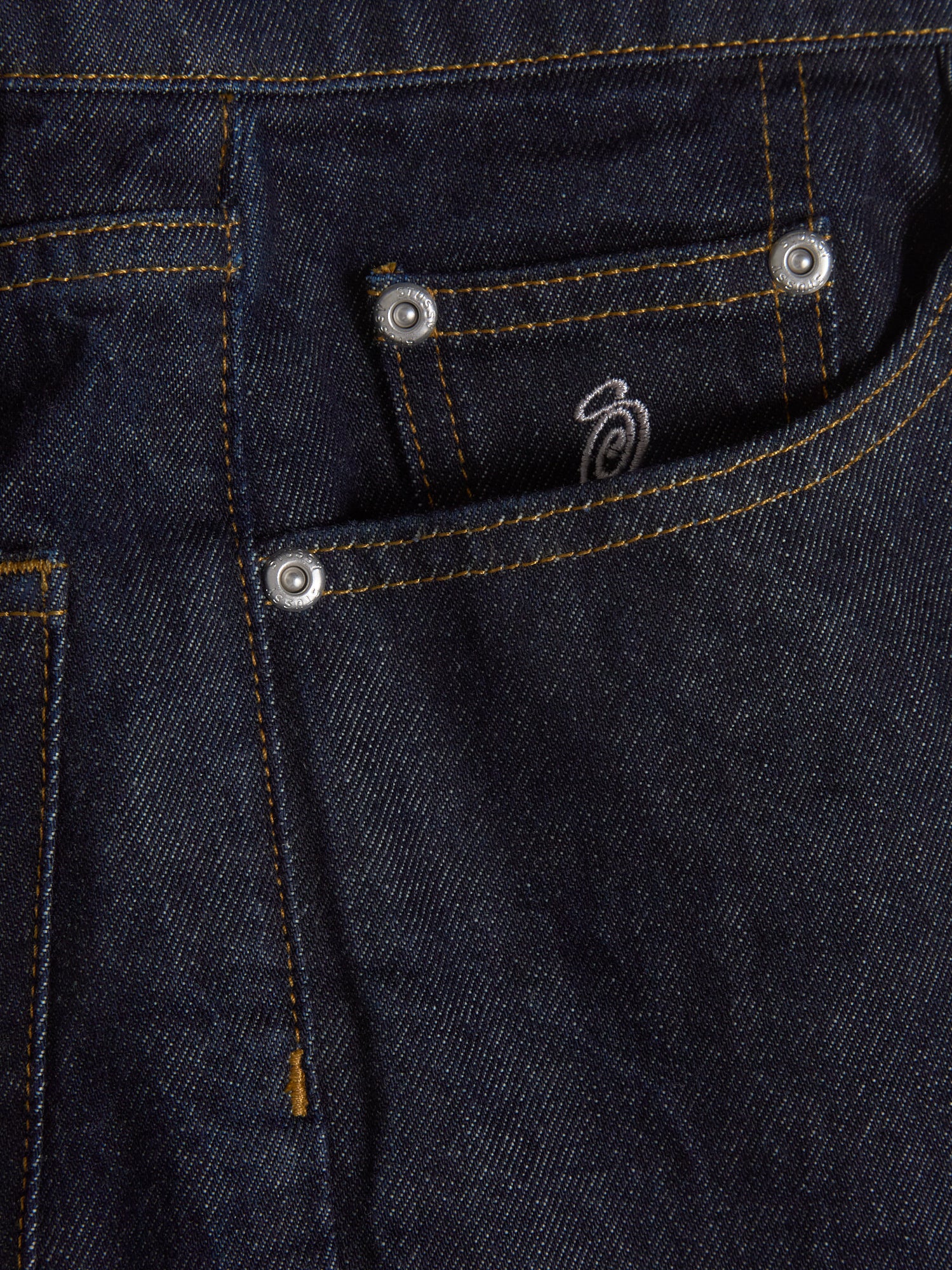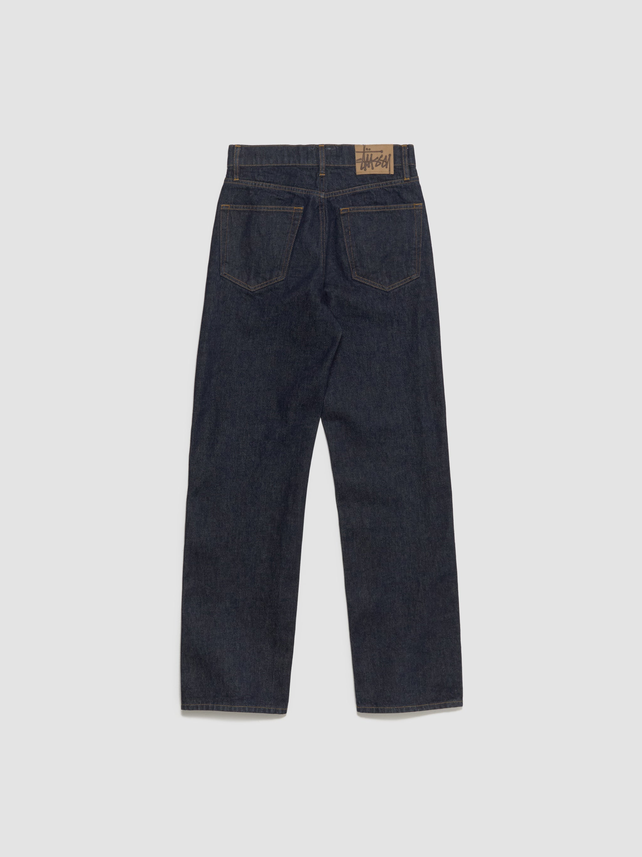 Stüssy New Classic Jean-Denim Pants in Rinsed Indigo are made from 100% cotton following a straight-leg silhouette with a leather logo patch at the back.