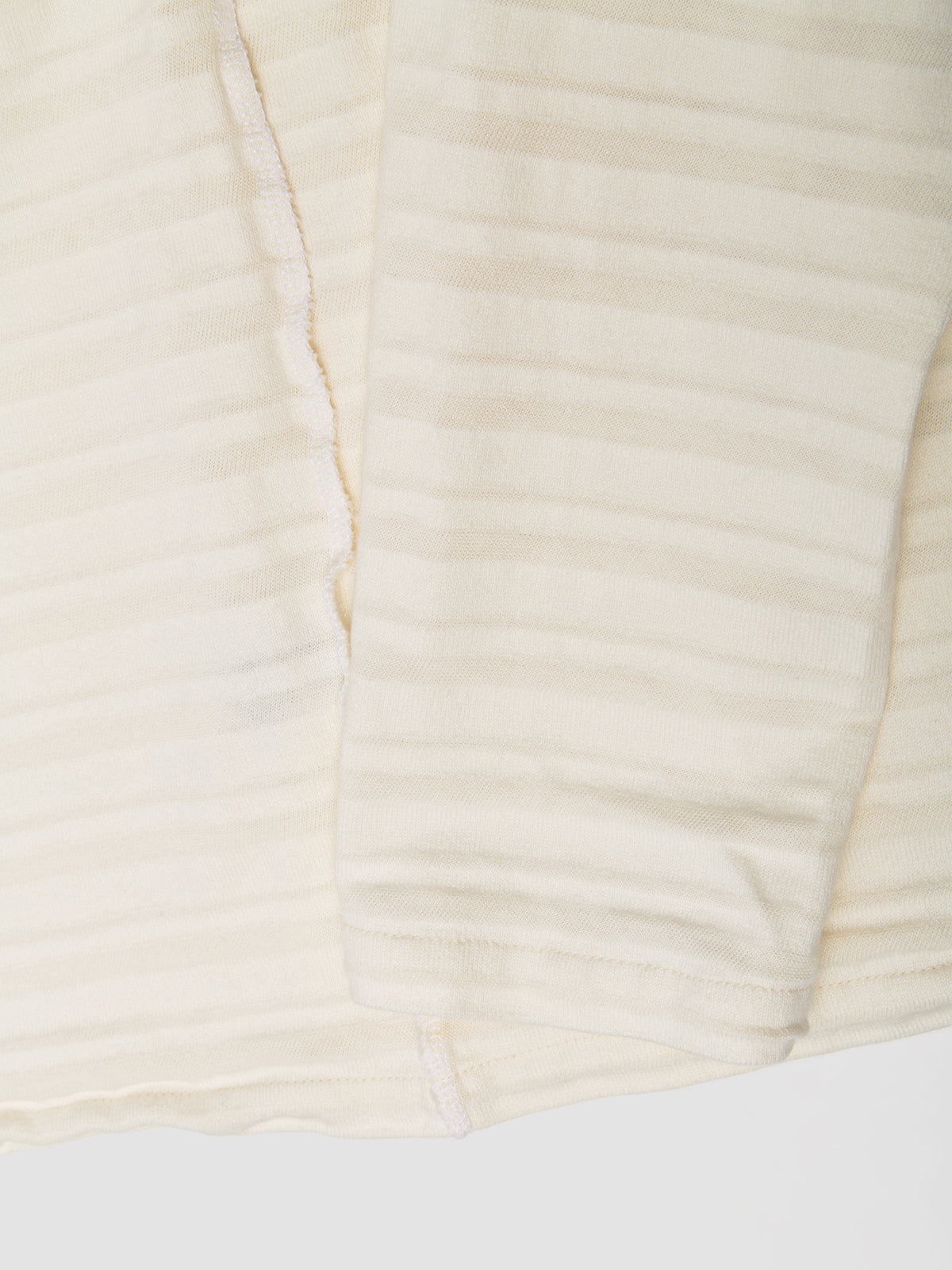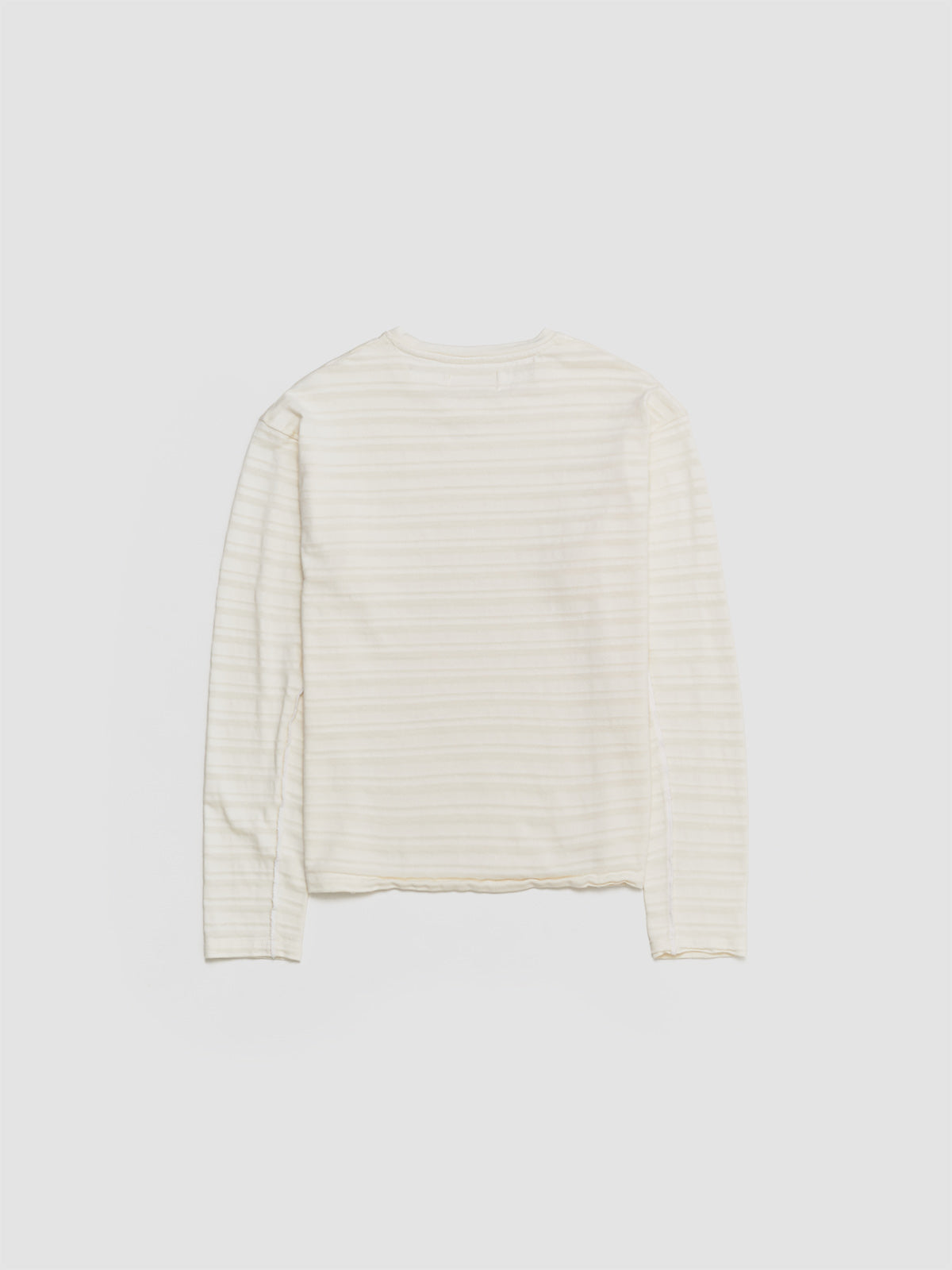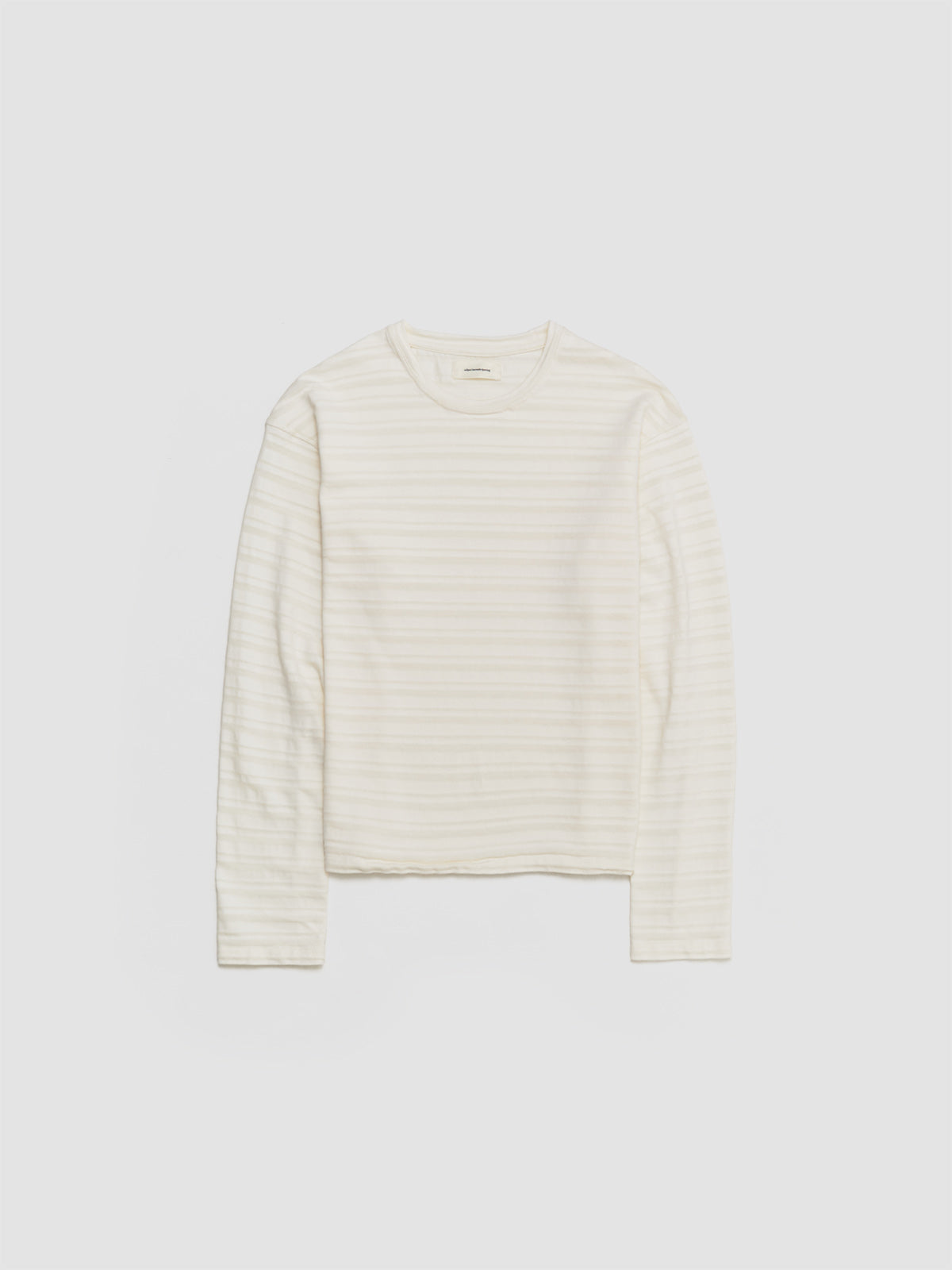 mfpen Round Neck Sweater in Off White Stripe is made from 100% cotton following a relaxed silhouette with semi-sheer horizontal stripes.