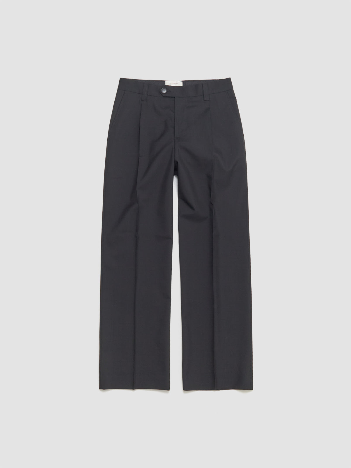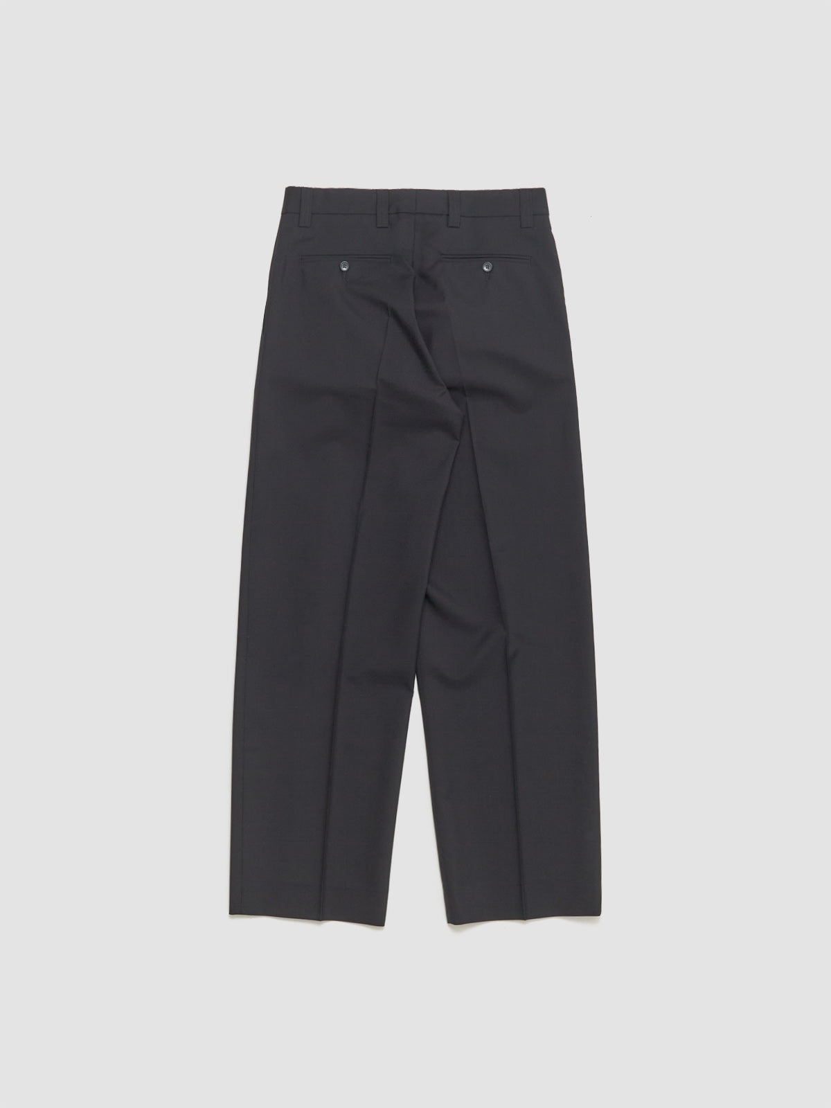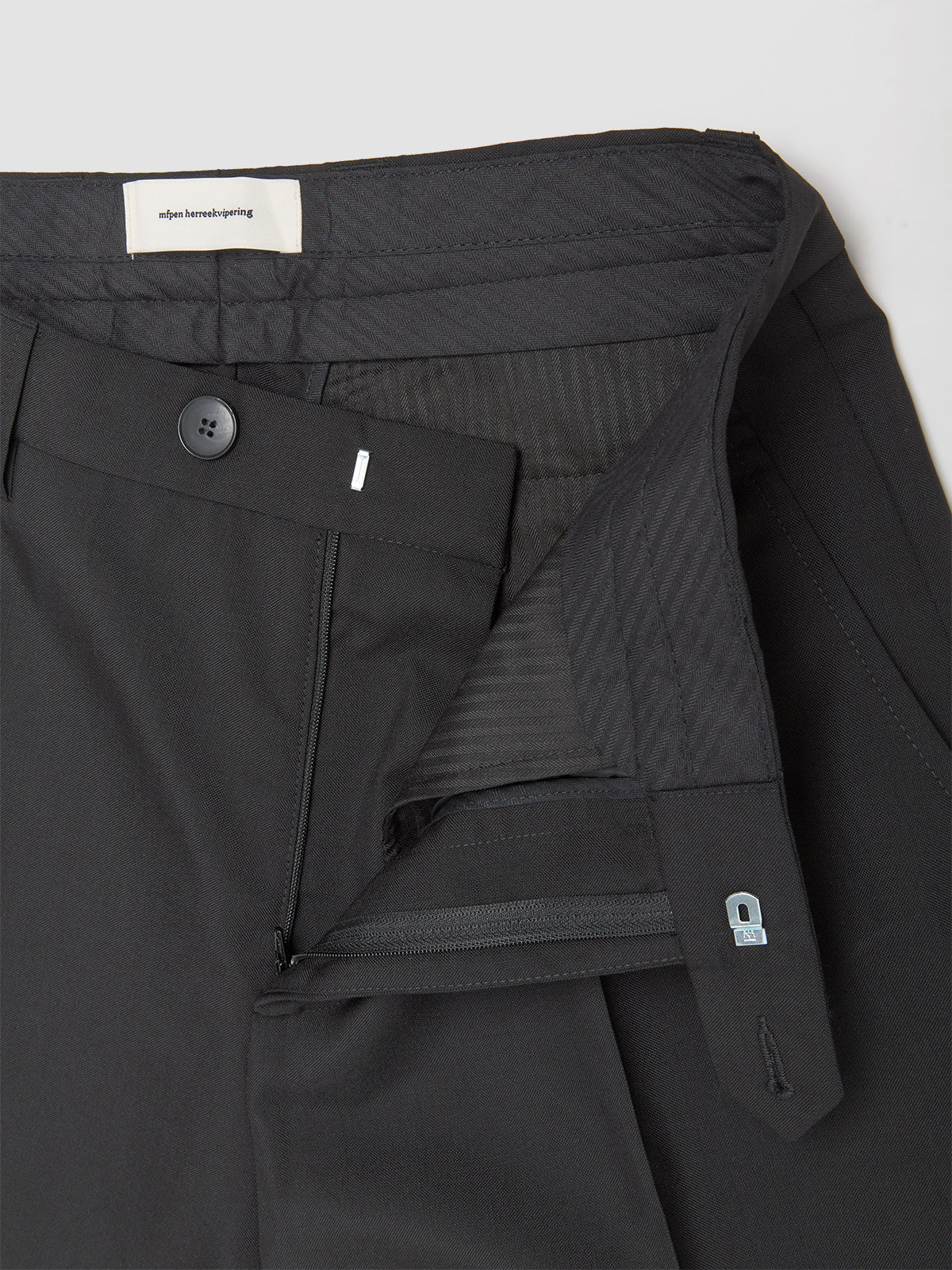 mfpen Service Trousers in Black Tropical Wool are made from 100% wool following a straight silhouette with pressed pleats.